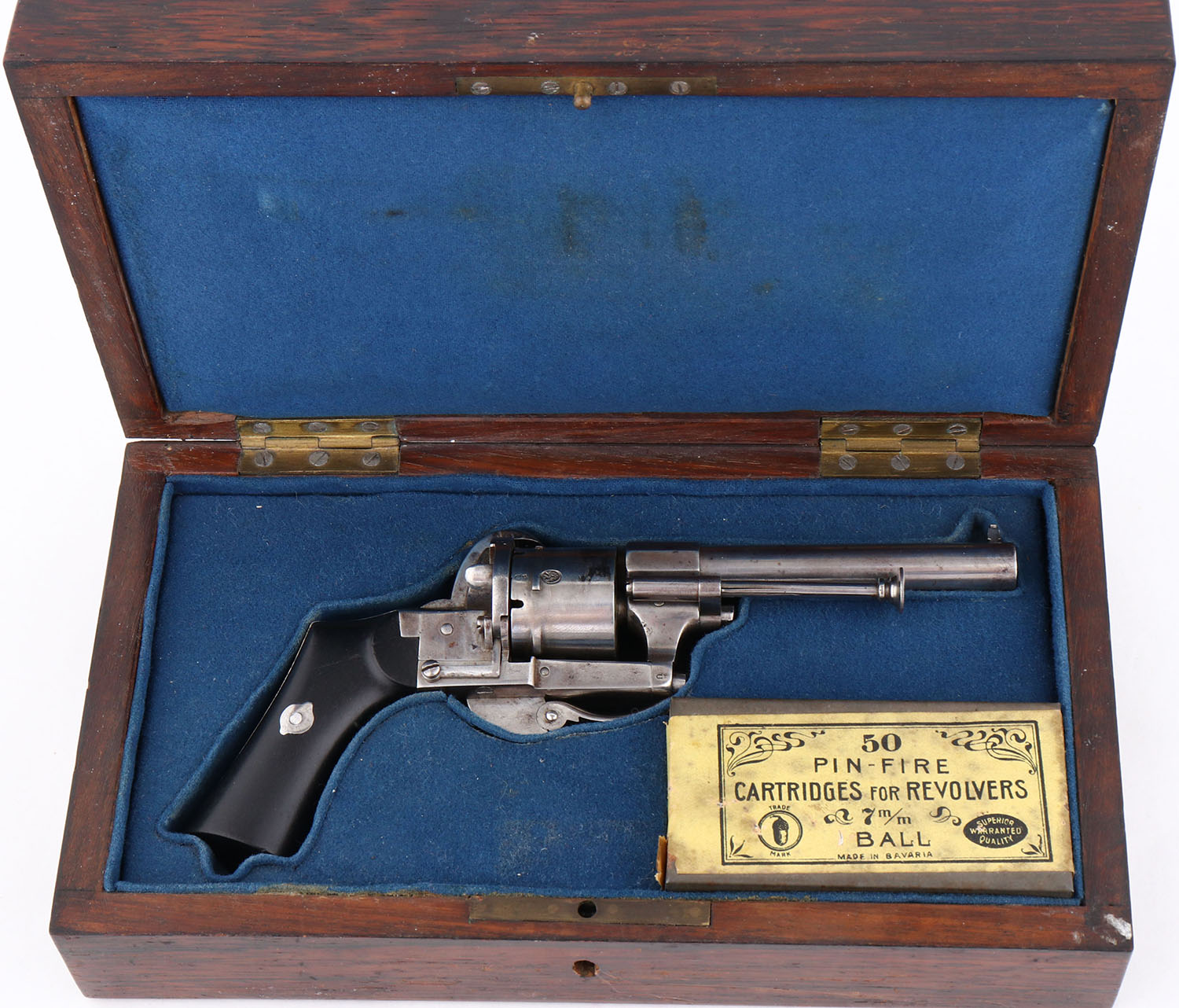 Belgian Pinfire Folding Trigger Pistol, CAL: 7mm, MFG: 1870's- 80's, SN: NSN, Double Action Revolver, 3 3/4'' barrel. Gun has minimal markings, there are (2) Crown over ''U'' & one other Belgian proof mark. The two piece wood grips are excellent, with minor handling marks. The polished steel metal components are very good. There are visible buff lines & minor areas of spotting. Bore is very good & bright, with intermittent pitting. The barrel holds a block elevated bead. Comes in wood case, with blue interior & a full tin box of 7mm pinfire ammo, ammo is excellent. A nice Belgian pinfire set. Antique, No FFL Req. - Value: 400 to 1000