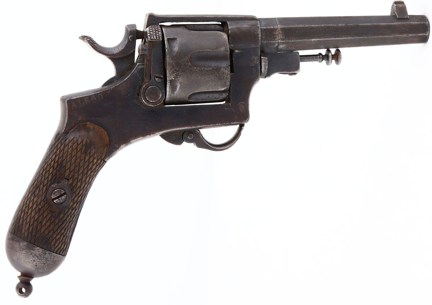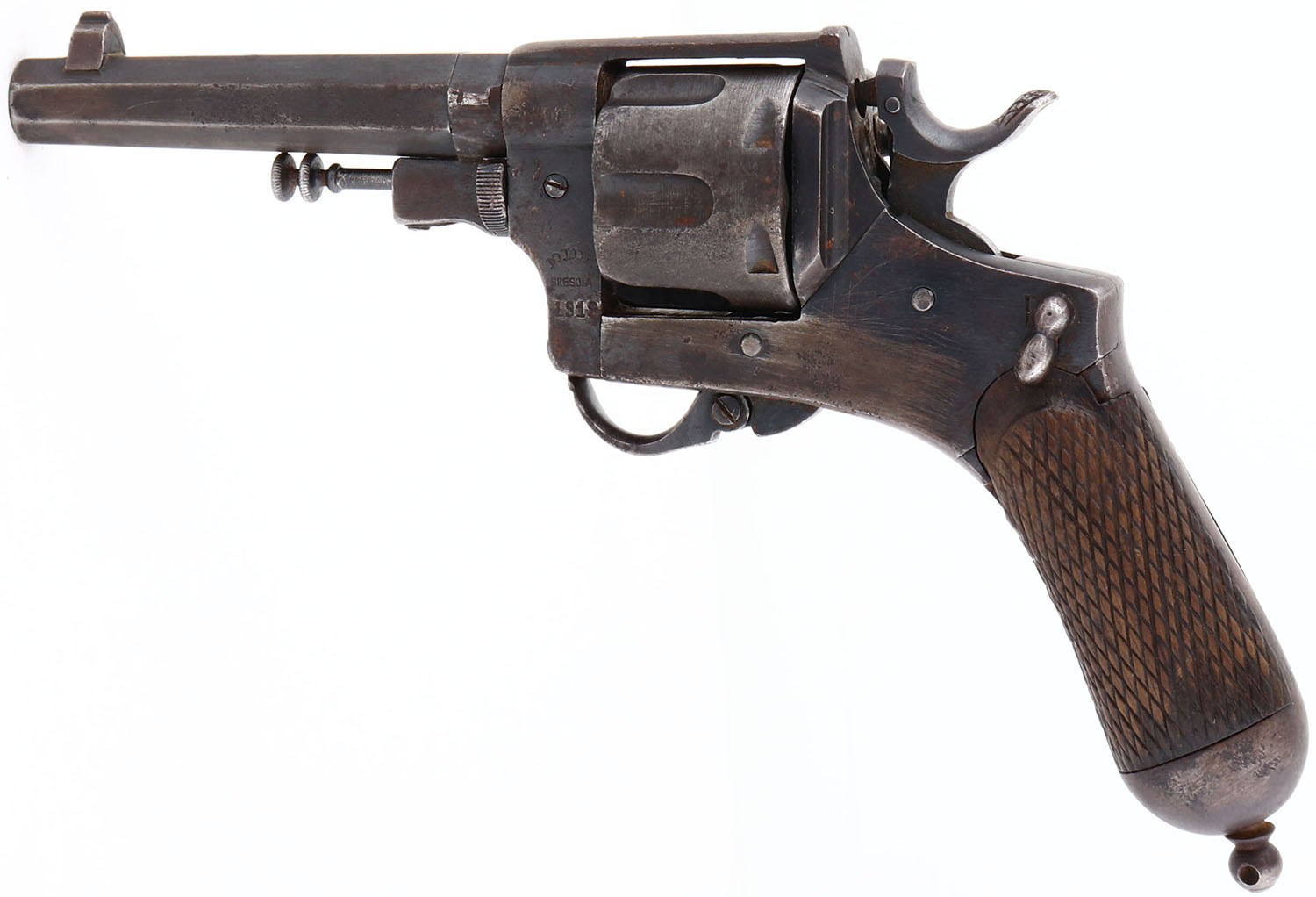 Mida Brescia, Bodeo M1889, CAL: 10.35mm, MFG: 1919, SN: AL650, Double/Single Action Folding Trigger Revolver, 4 1/2'' barrel. The checkered wood grips are very good. There is one minor edge chip, with slightly thin checkering & overall wear from age. The finish on all metal components is a mix of remaining blue & brown patina, with areas worn to metal grey. There is cleaned pitting throughout. Bore is fair, with consistent pitting & roughness amongst rifling. The barrel holds a block elevated front sight. An Italian revolver named after the head of the Italian firearm commission, Carlo Bodeo. It was produced by a wide variety of manufacturers between 1889 & 1931 in both Spain & Italy. FFL or C&R Req. - Value: 150 to 350