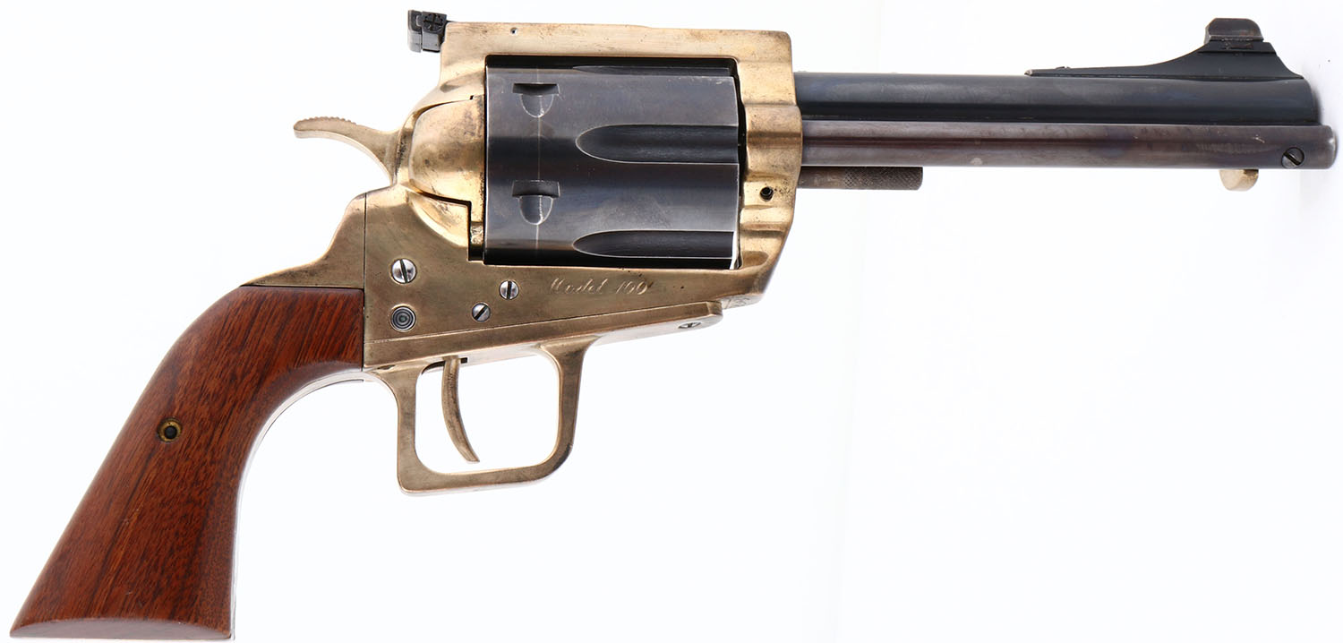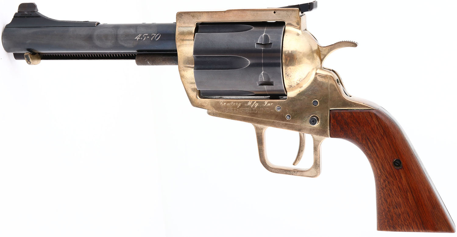 Century Mfg Inc, Model 100, CAL: 45-70, MFG: 1970's-80's, SN: 968, Single Action Revolver, 6 1/2'' barrel. The wood grips are excellent. There are minor scrapes to the finish. The metal blue finish on the barrel & cylinder rates 95%, with scuffs & a drag line on the cylinder. The ejector rod housing has toned to a plum patina. The brass frame is excellent, with a thin haze. Bore is excellent & minty. The frame holds an adjustable rear sight & a ramp elevated blade front sight. FFL Req. - Value: 1000 to 2500