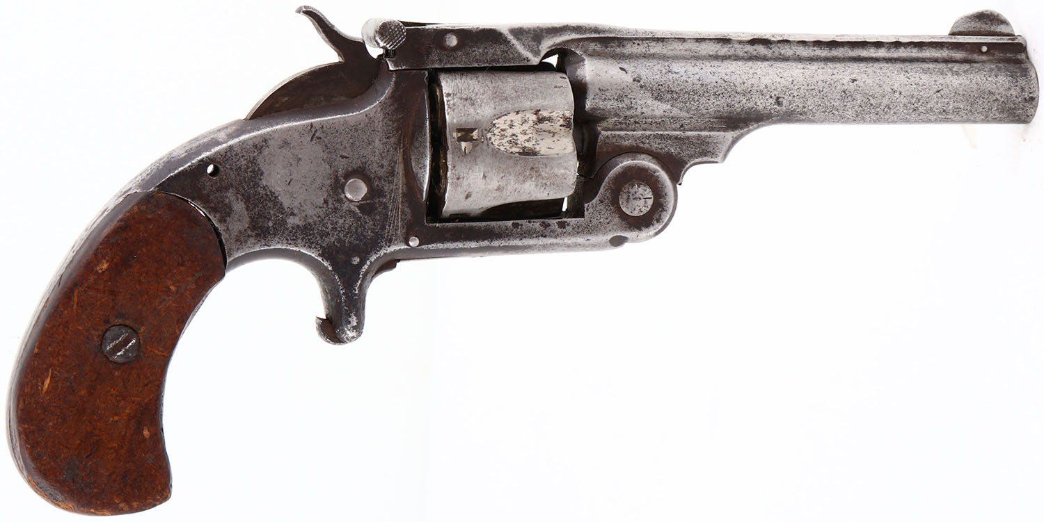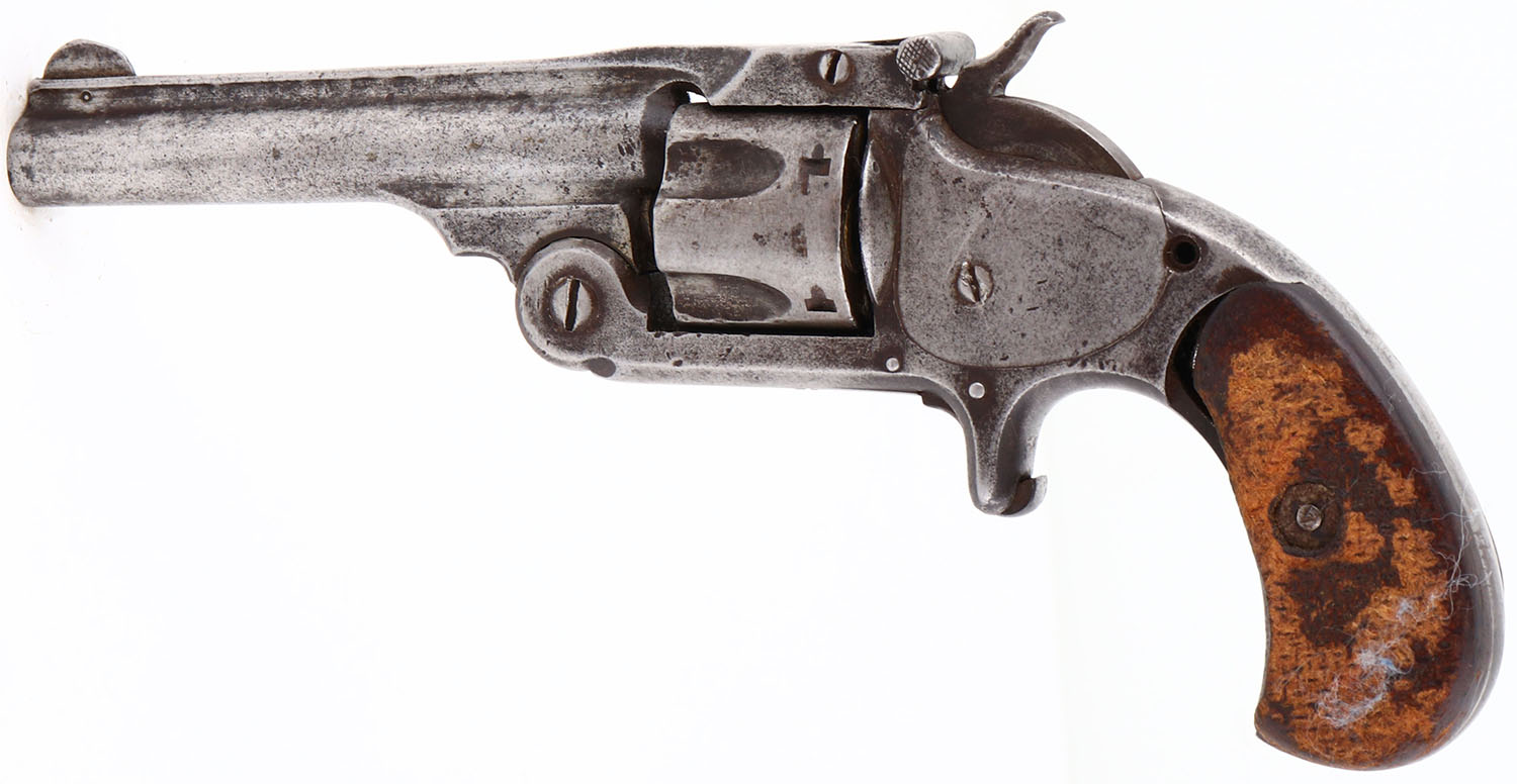 Unmarked Parts Gun, Harrington & Richardson Top Break?, CAL: N/A, MFG: N/A, SN: 39291, Single Action Revolver, 3 1/2'' barrel. The wood grips are fair. The metal has worn to metal grey, with spotting toned to a brown patina. Bore is poor. Barrel has single front blade. None of the mechanics are functioning properly. SOLD AS-IS NO RETURNS. FFL or C&R Req. - Value: 40 to 100