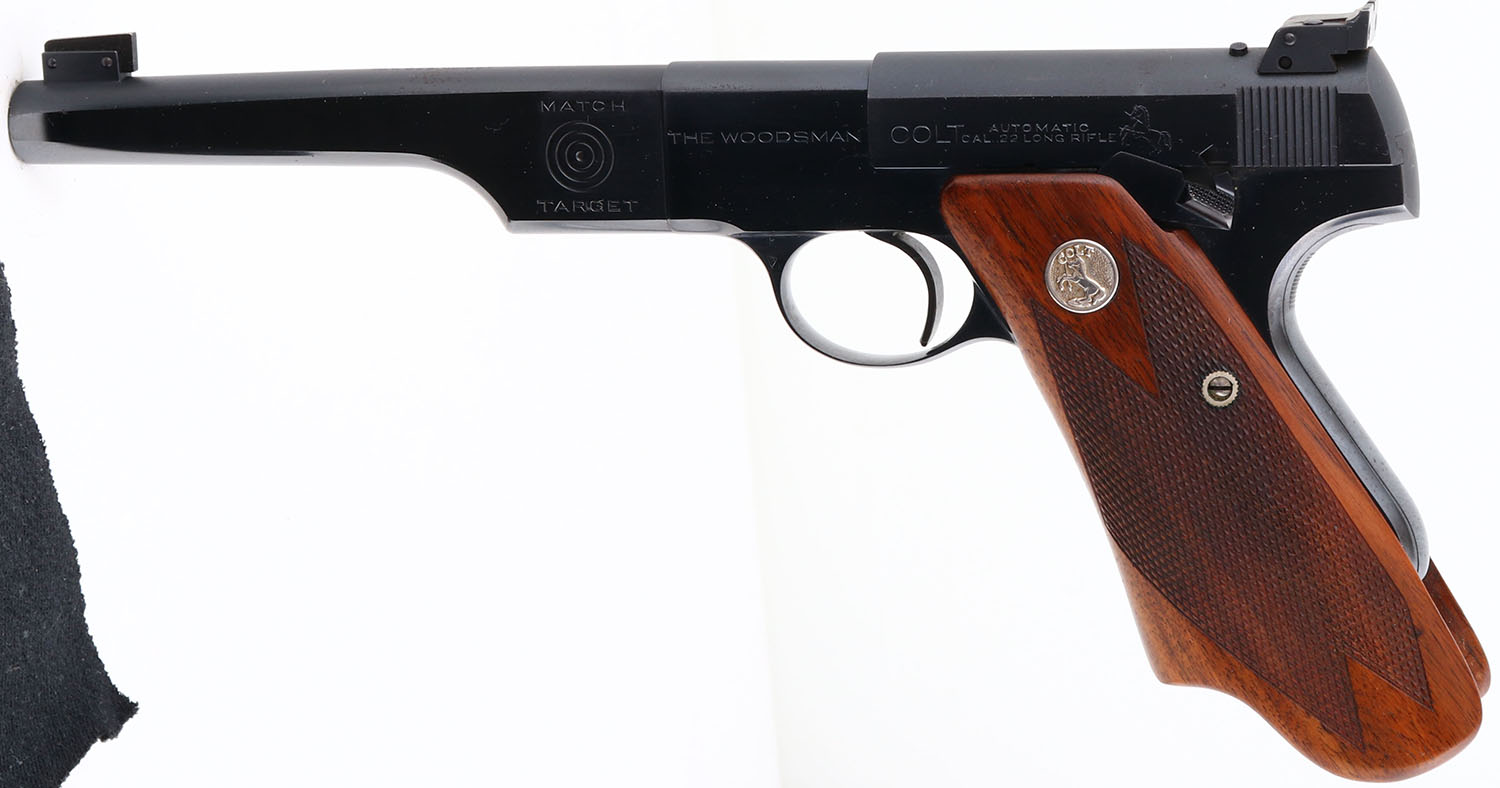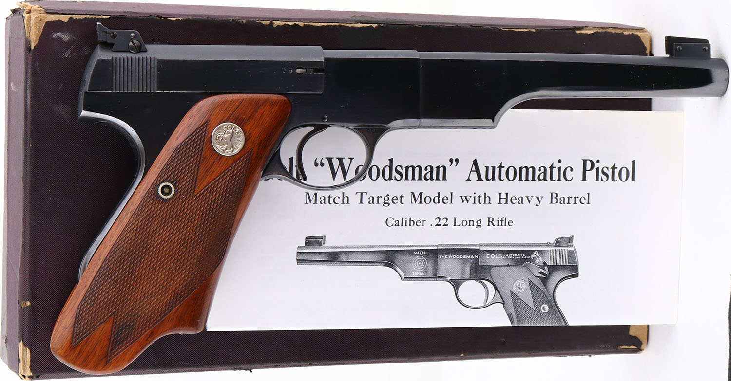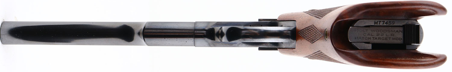 RARE & BOXED, Colt, Model ''The Woodsman Match Target'', CAL: 22LR, MFG: 1940, SN: MT7459, Semi-Auto Pistol, 6 5/8'' barrel. The top of the barrel is marked ''COLT'S PT.F.A. MFG. CO. HARTFORD. CT. U.S.A ./PAT. DES. 110.887'' &''MATCH/TARGET'' on the left side of the barrel, ''THE WOODSMAN'' is marked on the left side of the frame &''COLT/AUTOMATIC/CAL. .22 LONG RIFLE'' on the slide next to the Rampant Colt. The highly desired Colt medallion & checkered ''Elephant Ear'' grips are excellent, near mint, with both side & front screw present. The metal blue finish rates 98% overall, with very light surface blemishes. Bore is excellent, near mint. Factory Partridge sights. Correct Colt detachable magazine is marked in (3) lines ''COLT WOODSMAN, CAL: .22LR, MATCH TARGET MOD''. Comes in original box, with owners manual, rare hang tag & tool. Box edges/corners show wear. Exceedingly nice, all original Colt in very high collectors condition. FFL or C&R Req. - Value: 2000 to 4000