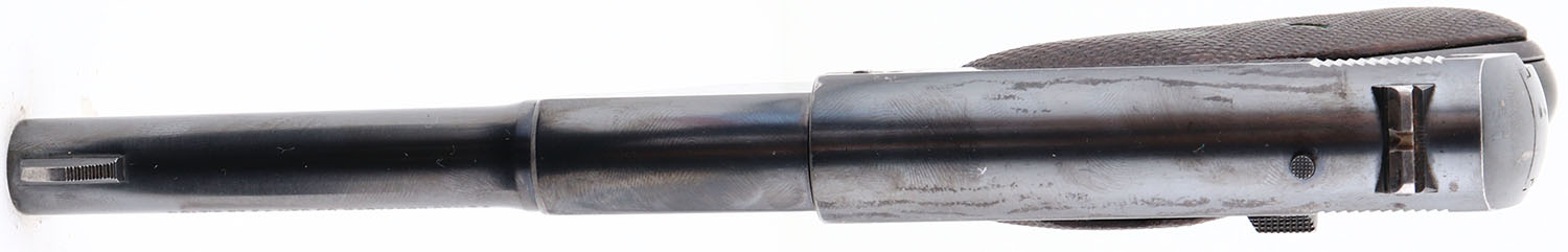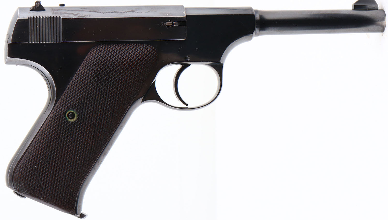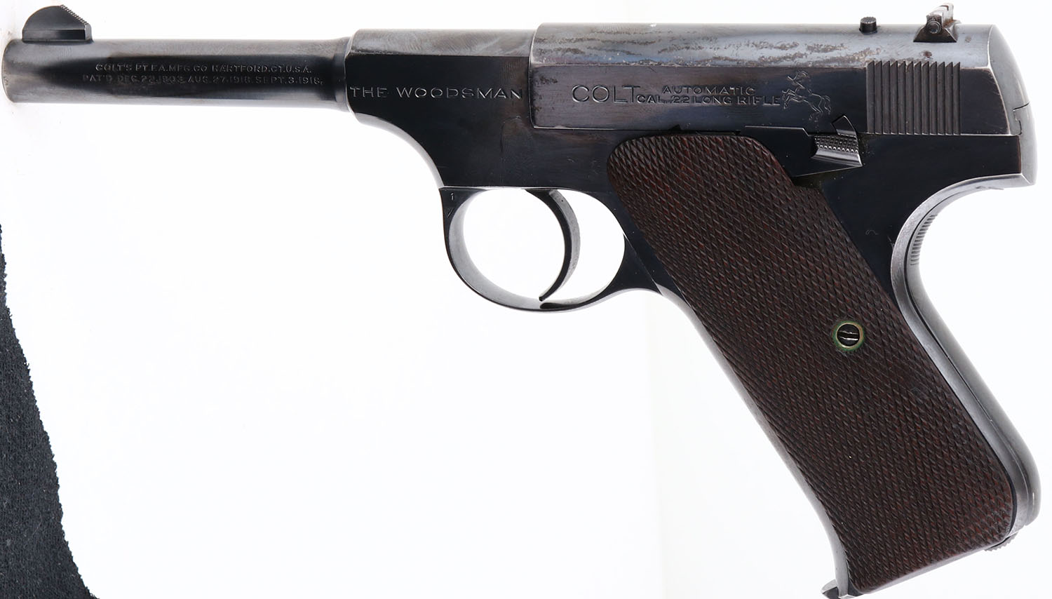 Colt, Model ''The Woodsman'', CAL: 22LR, MFG: 1928, SN: 57490, Semi Auto Pistol, 4 1/2'' barrel. The original, checkered wood grips are excellent. The metal blue finish rates 95% overall, with spotting worn to metal grey. Bore is excellent. The slide & barrel hold factory sights. Colt marked mag. FFL or C&R Req. - Value: 400 to 800