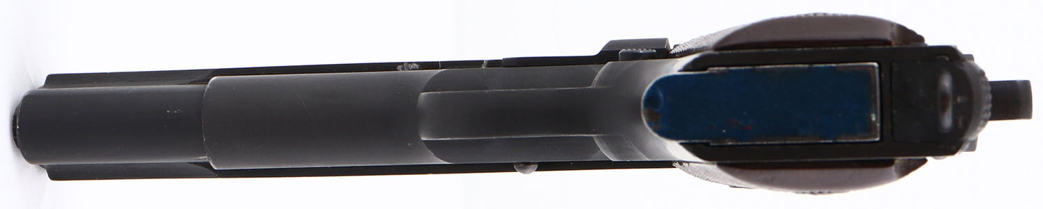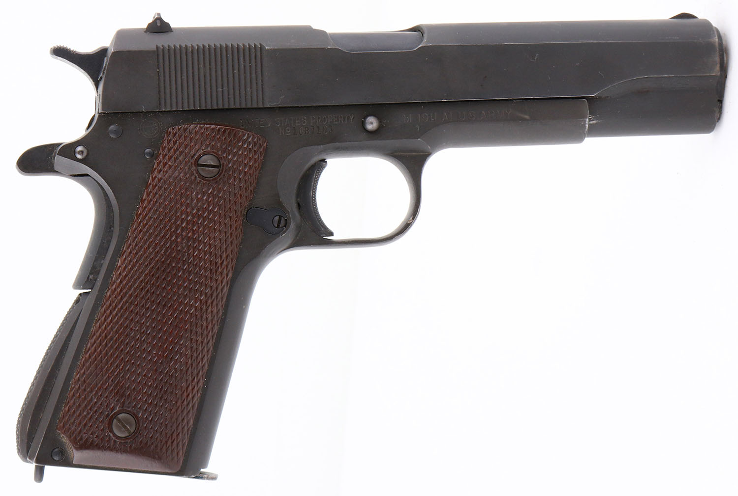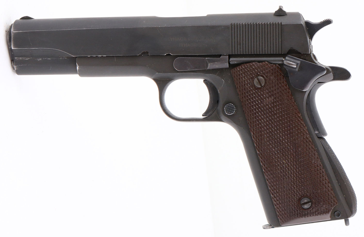 Ithaca, Model 1911 U.S. Army A1, .45 ACP Cal., Semi-Auto Pistol, Mfg. 1944, SN: 1887103, 5'' barrel. ''ITHACA GUN CO., INC. ITHACA N.Y.'' stamped on rear of left side of slide. ''UNITED STATES PROPERTY'', ''M1911 A1 U.S. ARMY'' & ''No. 1887103'' are all stamped on right side of frame. ''P'' stamp on the top of frame. ''FJA'' (Frank J. Atwood) Inspector Stamped behind trigger on left side. Lt Col Atwood was the US Army Executive Officer in charge of all ordnance activities in his district. Lt Col Atwood was assigned to the Rochester Ordnance District & had sole responsibility for inspecting & accepting or rejecting all war material that was produced or manufactured under Government contract in this district from mid-1942 through early 1946. During this time frame in the Rochester district both the Remington-Rand & Ithaca factories fell under his control. Consequently if you look at any model of M1911A1 produced by either of those companies, you will see his initials ''F.J.A.'' prominently stamped on the left side of the pistol frames. The military metal finish rates at 95%. The checkered hard plastic grips are excellent, with very tiny dings. Exterior of barrel is blued. Bore is excellent, Fitted with the standard lower profile fixed sights. Unmarked magazine has odd blue film on bottom. Lanyard staple on bottom strap. As Most of these guns were re-arsenal all parts may not be original to pistol. Serrated backstrap. Backstrap squeeze safety. A very nice US Property, Army stamped WWII example. FFL or C&R Req. - Value: 2000 to 3500