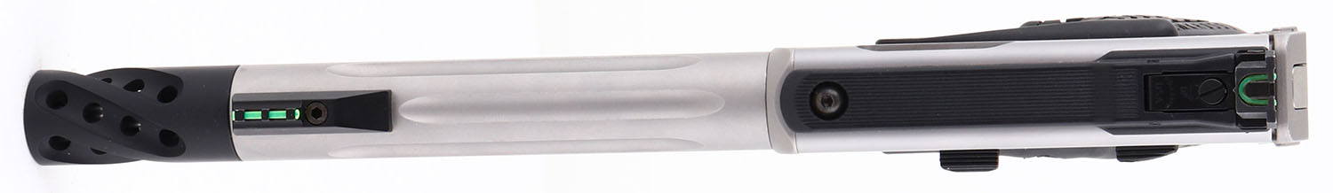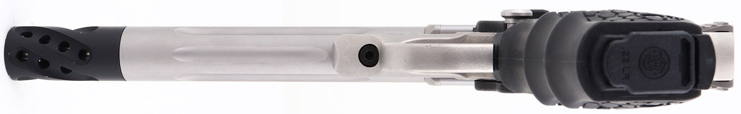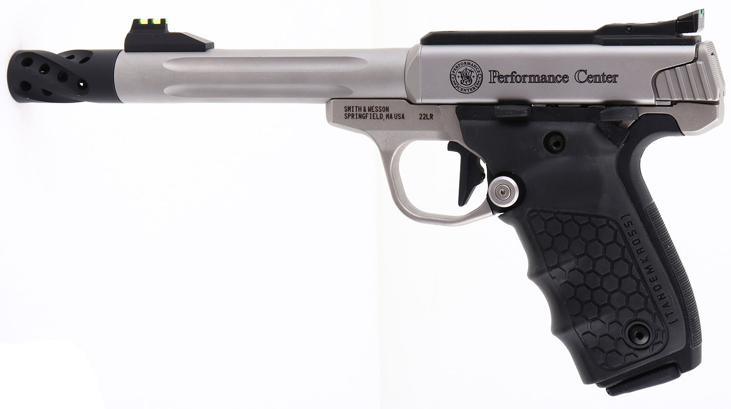 NEW BOXED, Smith & Wesson, Model ''SW 22 Victory Performance Center'', CAL: 22 LR, MFG: Modern, SN: UEF1332, Semi Auto Pistol, 7 1/2'' fluted barrel, w/muzzle brake. The TANDEMKROSS honeycomb grips are excellent. The satin silver finish rates 100% overall,. Bore is mint. The pistol is fitted with an adjustable two-dot green fiber optic rear sight & ramp elevated green fiber optic front sight. Comes in original box, with S&W Performance Center zippered carrying case, lock, owners manual, picatinny rail & extra magazine. A top of the line target pistol. NOS. FFL Req. - Value: 600 to 800