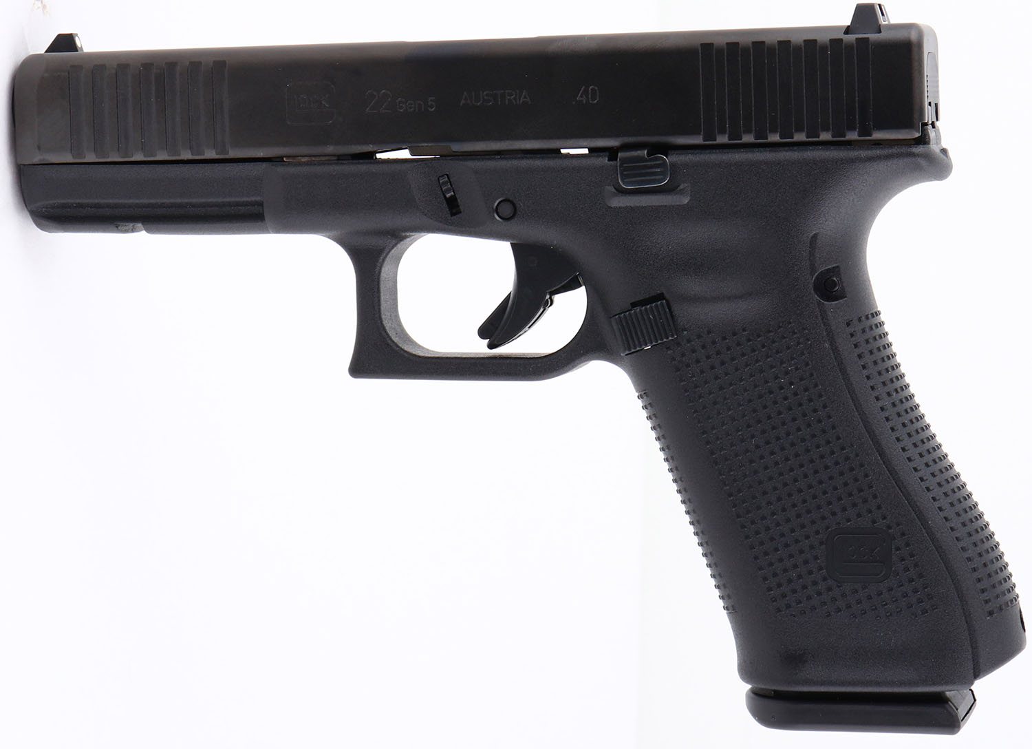 NEW CASED, Glock, Model G22 GEN 5, CAL: 40 S&W, MFG: Modern, SN: BYWD863, Semi-Auto Pistol, 4.5'' barrel. The polymer frame & grips are mint. The factory black colored slide is mint. Bore is mint. Original sights. Comes in the original factory case with 3 15rds mags, speed loader, two extra grip attachments, paperwork, brush & cleaning rod, NOS. FFL Req. - Value: 500 to 650