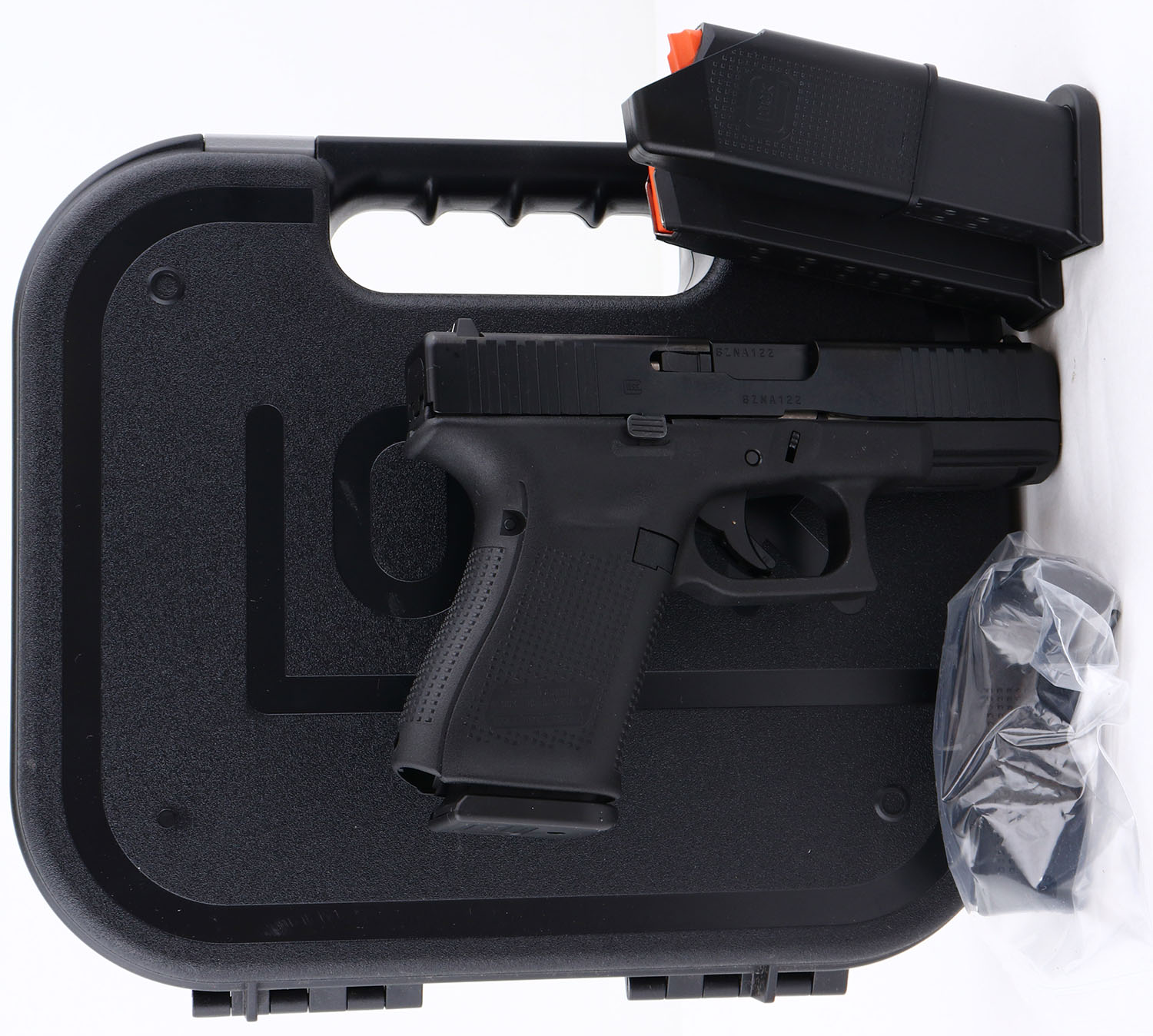 NEW CASED, Glock, Model G19 GEN 5, CAL: 9mm (9x19), MFG: Modern, SN: BZNA122, Semi-Auto Pistol, 4'' barrel. The polymer frame & grips are mint. The factory black colored slide is mint. Bore is mint. Original sights. Comes in the original factory case with 3 15rds mags, speed loader, two extra grip attachments, paperwork, brush, cleaning rod & lock, NOS. FFL Req. - Value: 550 to 650