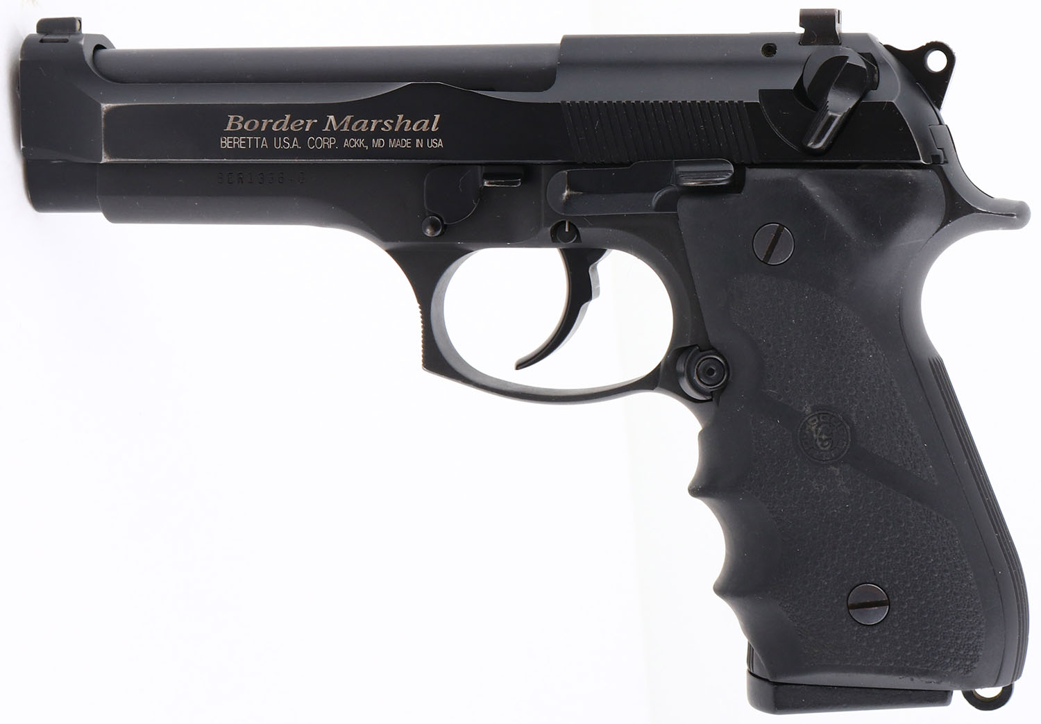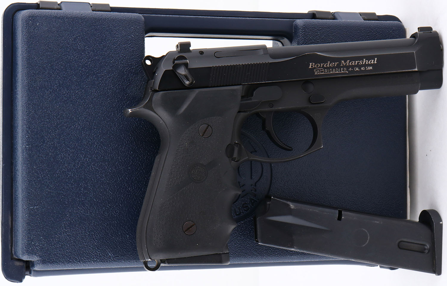CASED Beretta, Model Border Marshal, CAL:40 S&W, MFG: Modern, SN: BER133640, Semi-Auto Pistol, 4.5'' barrel. The rubber grips are excellent. The factory black metal finish on slide rates 97% & 99% frame. Bore is excellent. Original sights. Comes in the original factory case, with additional 10rd mag. FFL Req. - Value: 800 to 1200