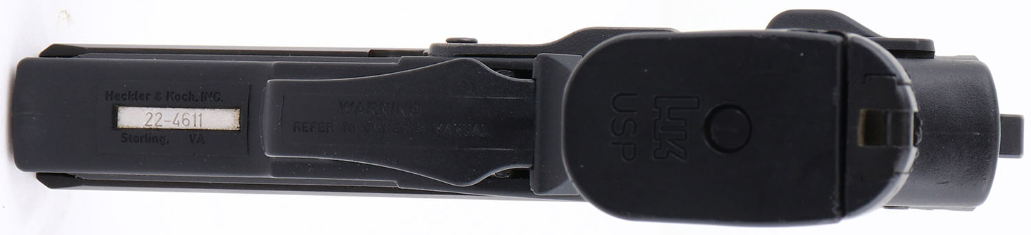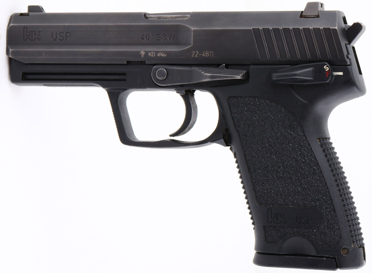 CASED Heckler & Koch, Model USP, CAL:40 S&W, MFG: Modern, SN: 22-4611, Semi-Auto Pistol, 4'' barrel. The polymer frame & grips are mint. The factory black metal finish on slide rates 98%. Bore is excellent. Universal mounting groves for mounting accessories. Ambidextrous mag release lever. Oversized trigger guard for use with gloves. Original sights. Comes in the original factory case, with additional factory 13 rd mag. FFL Req. - Value: 800 to 1200