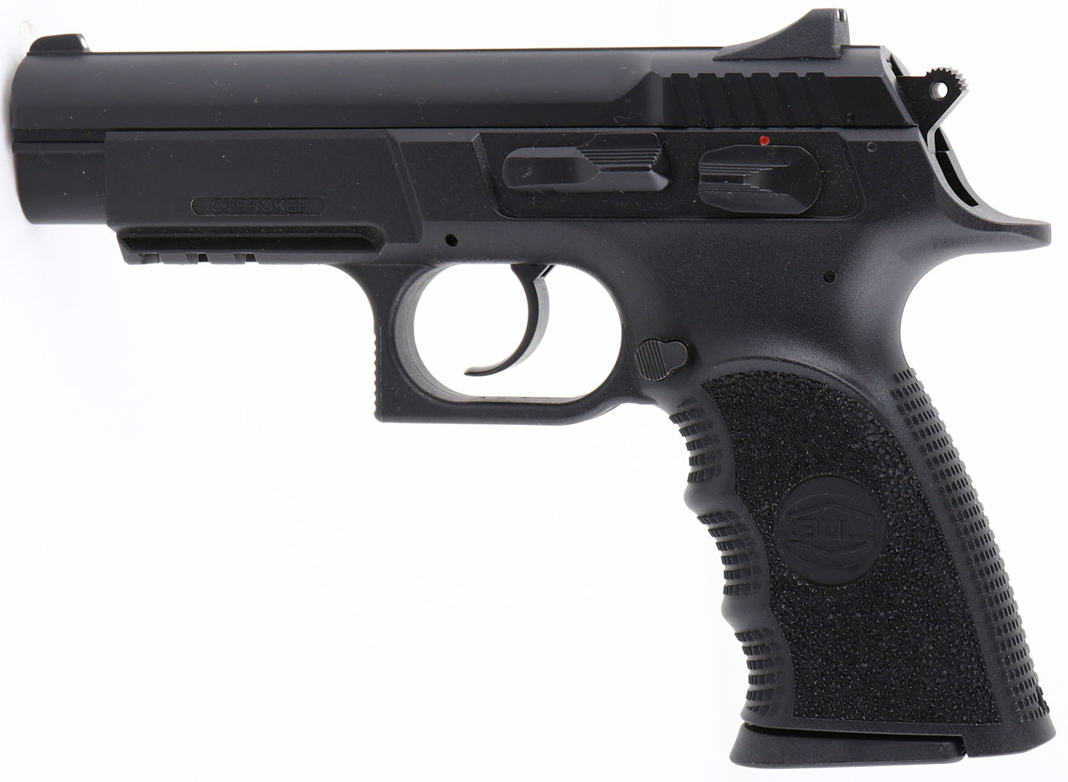 NEW CASED, BUL, Model Cherokee, CAL: 9mm, MFG: Modern, SN: CP-26188, Semi Auto pistol, 4 1/4'' barrel. The synthetic frame & stippled & finger grooved grip are excellent. The factory black finish rates 100% overall. Bore is mint excellent. Three white dot factory sights. Under frame picatinny rail for accessories & optics. Squared trigger guard. Double-action/single-action (DA/SA) system, with a safety lever. Comes in original factory box, with owners manual, additional 17 rd mag., brushes & cleaning rod. NOS. FFL Req. - Value: 500 to 650