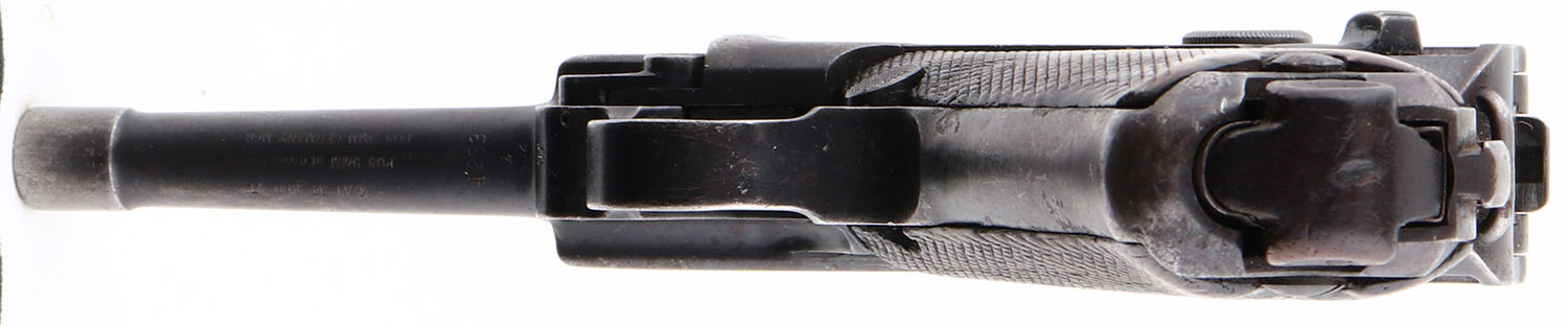 Mauser, Model P08 Lugar, Cal. 9mm, Semi-Auto, Mfg. 1935-39 German, SN: 8801, 3 7/8'' barrel, The original checkered wood grips are very good, with some smoothing of the checkering & a tiny corner chips at the bottom front & upper back of left grip. Metal blue finish is 65%. Stamped with SN ''8801'' on front of frame, ''1921'' on top of barrel, ''4253'' on side of barrel, ''71'' on a couple of smaller parts, ''S/42'' & ''01'' on toggle lock, & ''35'' on extractor. Has stock lug on backstrap. Bore is very good. Has wood magazine floorplate.. FFL or C&R Req. - Value: 800 to 1500