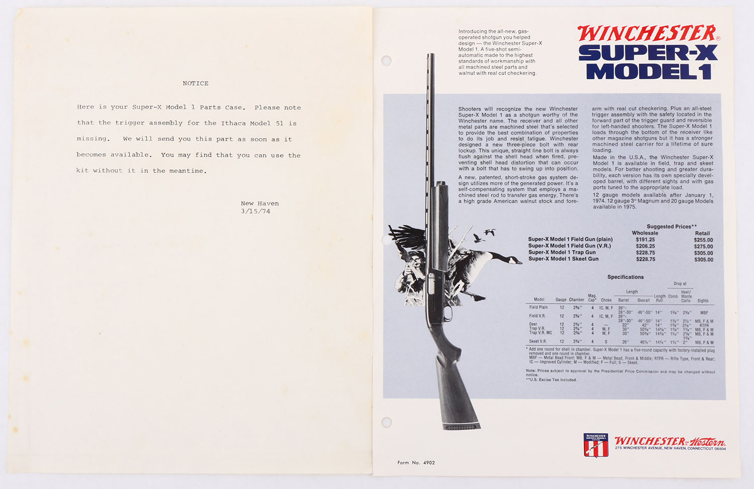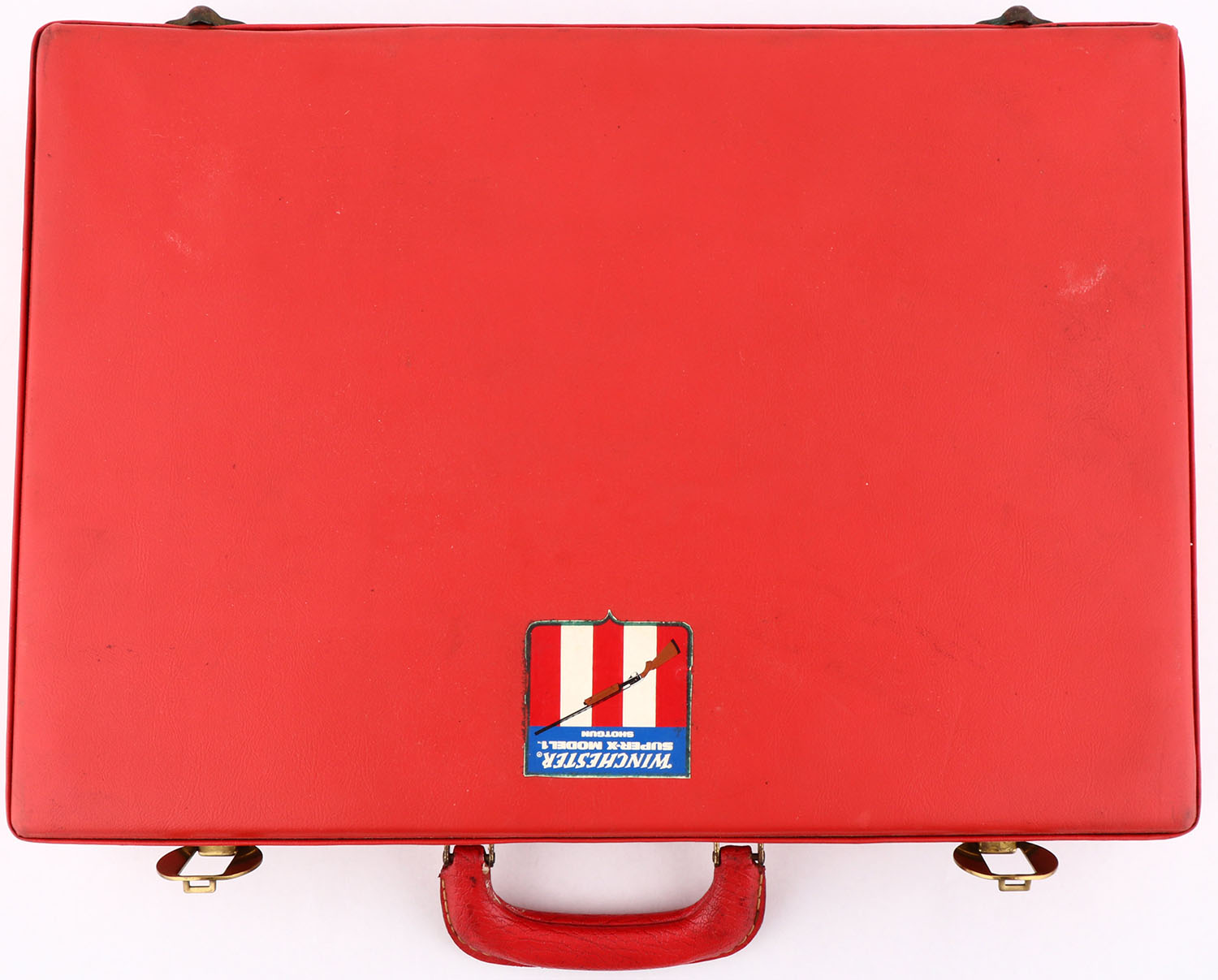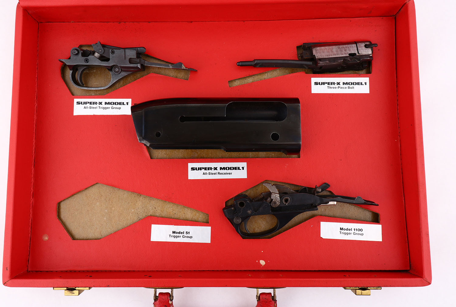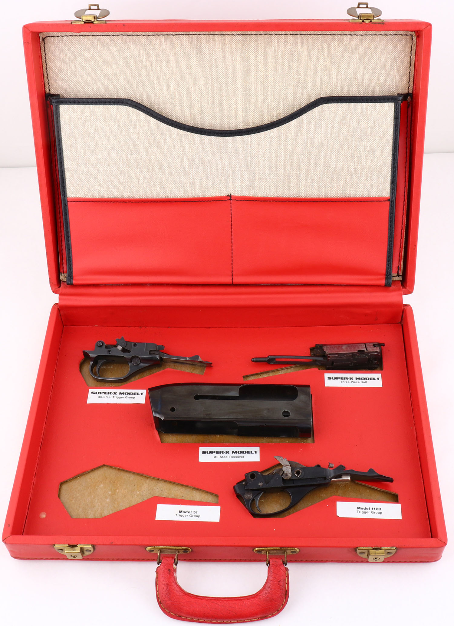 RARE, WINCHESTER SUPER-X MODEL 1 Salesman Marketing & Demonstration case. These rare cases with the components were sent to Company reps to promote the advances of the Winchester Super-X Model 1 over the competition. In the case is a Super-X Model 1 receiver, with the SN M2299, Trigger group & bolt, with their corresponding marked location. There is also a Remington Model 1100 trigger group & marked location & a location for an Ithaca Model 51which the trigger group is not included. Interestingly, it appears the Ithaca 51 trigger assembly was not included when originally shipped & likely was never sent, as the kit includes a letter which reads: ''NOTICE, Here is your Super-X Model 1 parts case. Please note that the trigger assembly for the Ithaca Model 51 is missing. We will send you this as soon as it becomes available. You may find that you can use the kit without it n the meantime. New Haven 3/15/74''. The kit also includes a Winchester Super-X Model 1 spec sheet. The red Winchester suitcase is in excellent condition. The contents is also excellent. We have not seen this kit come to market before. We do not know how many of these kits were actually produced, but surely the total number would be very small & surviving examples are likely far fewer. FFL Req - Value: 200 to 1000