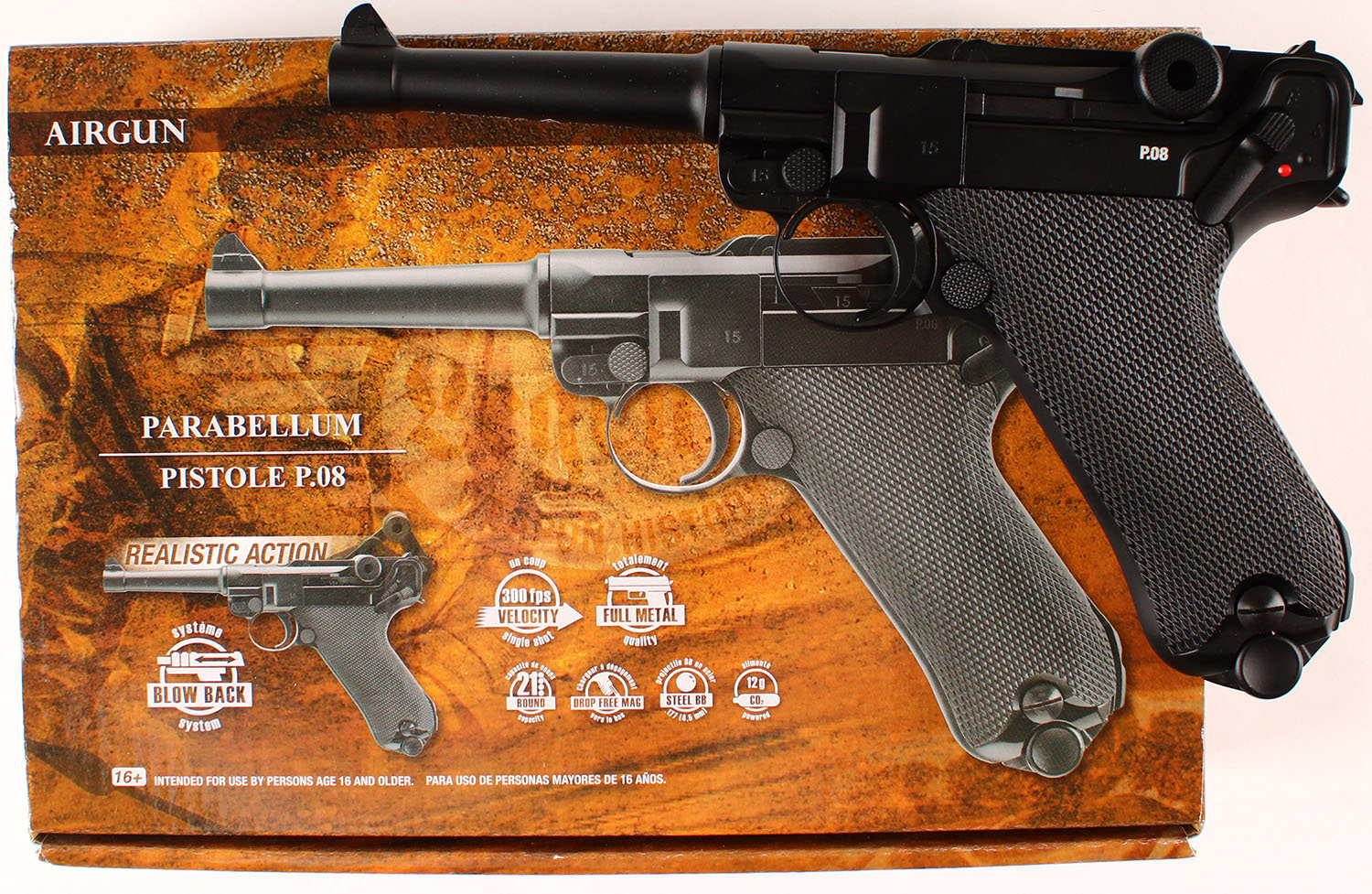 BOXED, Umarex Airguns, Model P.08, S/N: 15, Caliber 177, Semi CO2 action, 4'' barrel, checkered synthetic stock. Grade: Excellent + - Value: 80 to 160