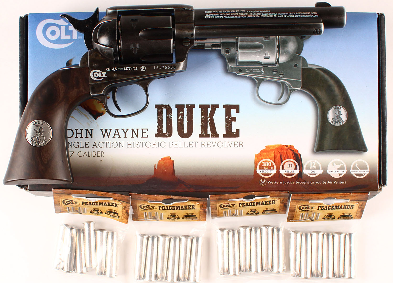 BOXED, Umarex Air Guns, Model Colt John Wayne Duke SAA 45, S/N: 15J75608, Caliber 177, Single action, 5 3/8'' barrel, synthetic grip. Grade: Excellent + - Value: 100 to 200