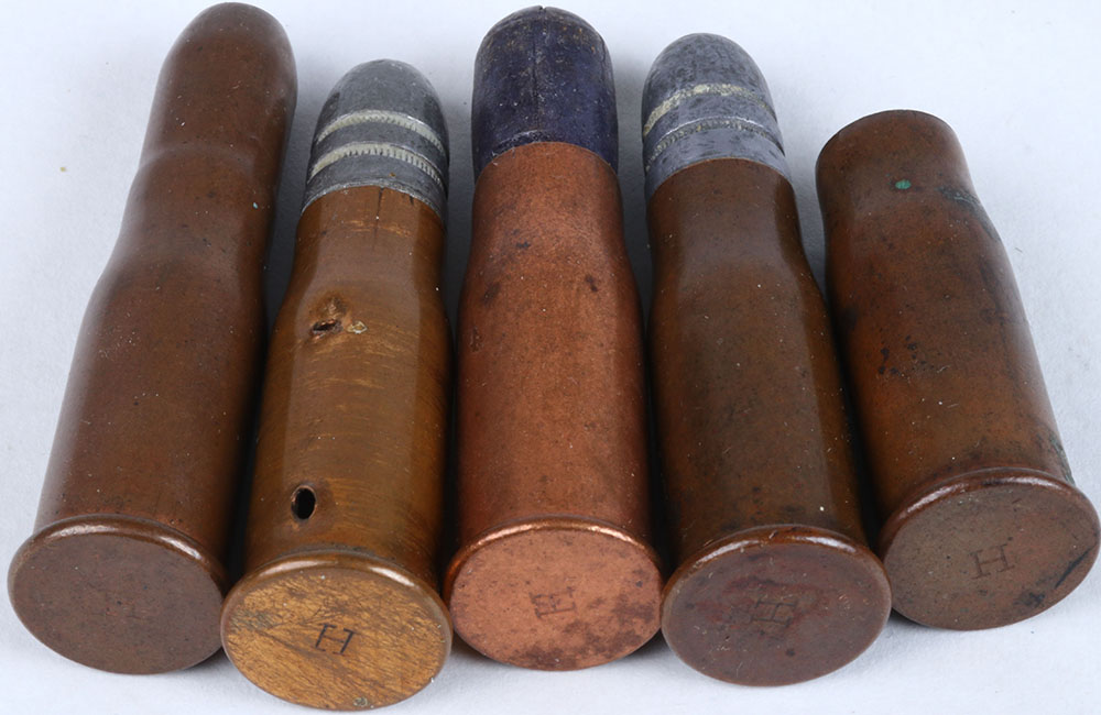 Lot of 5 WIN. 41 swiss R/F H/S= (IMP.) ''H'' 41 swiss board dummy, 2-CS. Holes, R.N.L. 2-KN. H/S= (IMP.) ''H'', 41 swiss, WIN. MFG. COP. CS., R.N.L. 2-KN. H/S= (IMP.) ''H'', 41 swiss , full length case shot load, gray wad H/S= (IMP.) ''H'', 41 swiss new empty CS. H/S= (IMP.) ''H'', 41 swiss shot load dark blue waxed paper sabot. Grade: Very Good ++ - Value: 40 to 70