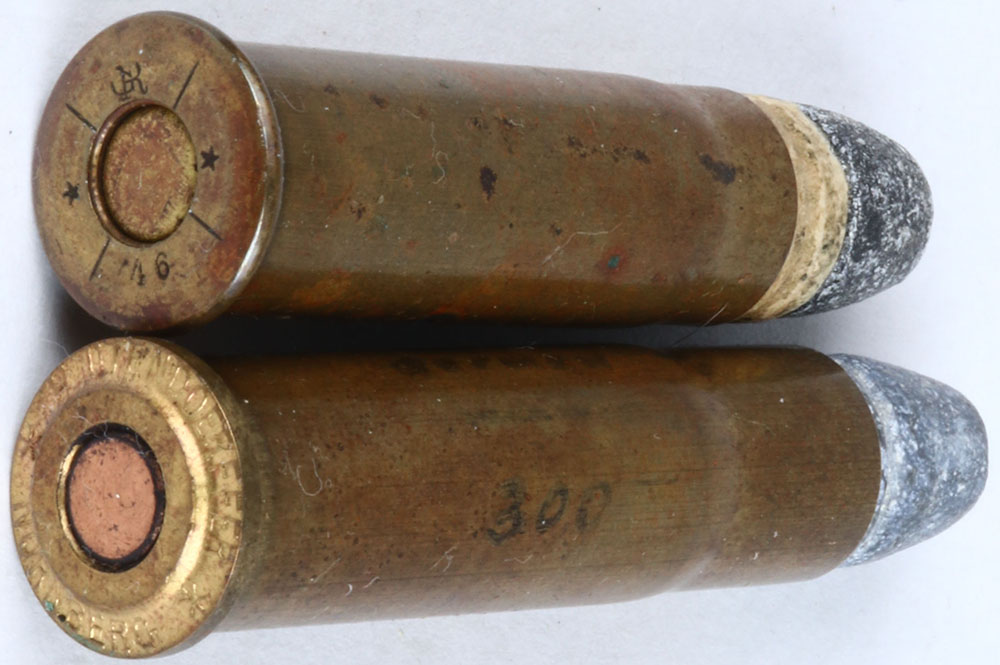 Lot of 2 (1) H/S= ''G'' (over) ''R'' 46 11.15 x 42R, large flat brass primer, PP. FNL. Target (1) H/S= (raised) ''H. UTENDOERFFER NURNBERG'' large flat copper primer, FNL. 1-GR. Grade: Excellent - Value: 20 to 50