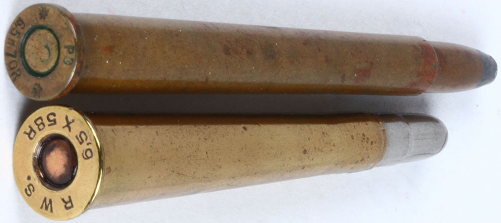 Lot of 2 (1) H/S= ''PS 6.5 x 70R'' oval brass primer, SP. GM. FN. -x (1) H/S= ''RWS 6.5 x 58R'' oval copper primer, SP. Full GM. Jacket FN. Grade: Very Good ++ - Value: 10 to 40