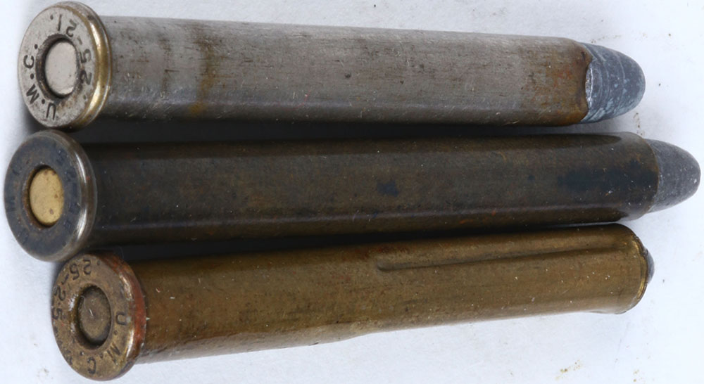 Lot of 3 VERY SCARCE variations H/S= ''U.M.C. 25-25'', (Stevens) black CS. Function dummy, H/S= ''U.M.C. 25-21'' (Stevens) -TIN. CS. Proof load-, SM. Oval NIC. PRI., F.N.L. H.P. H/S= ''U.M.C. 25-21'' half fluted case, appears to be a short range R.N.L. loading. Grade: Excellent - Value: 10 to 50