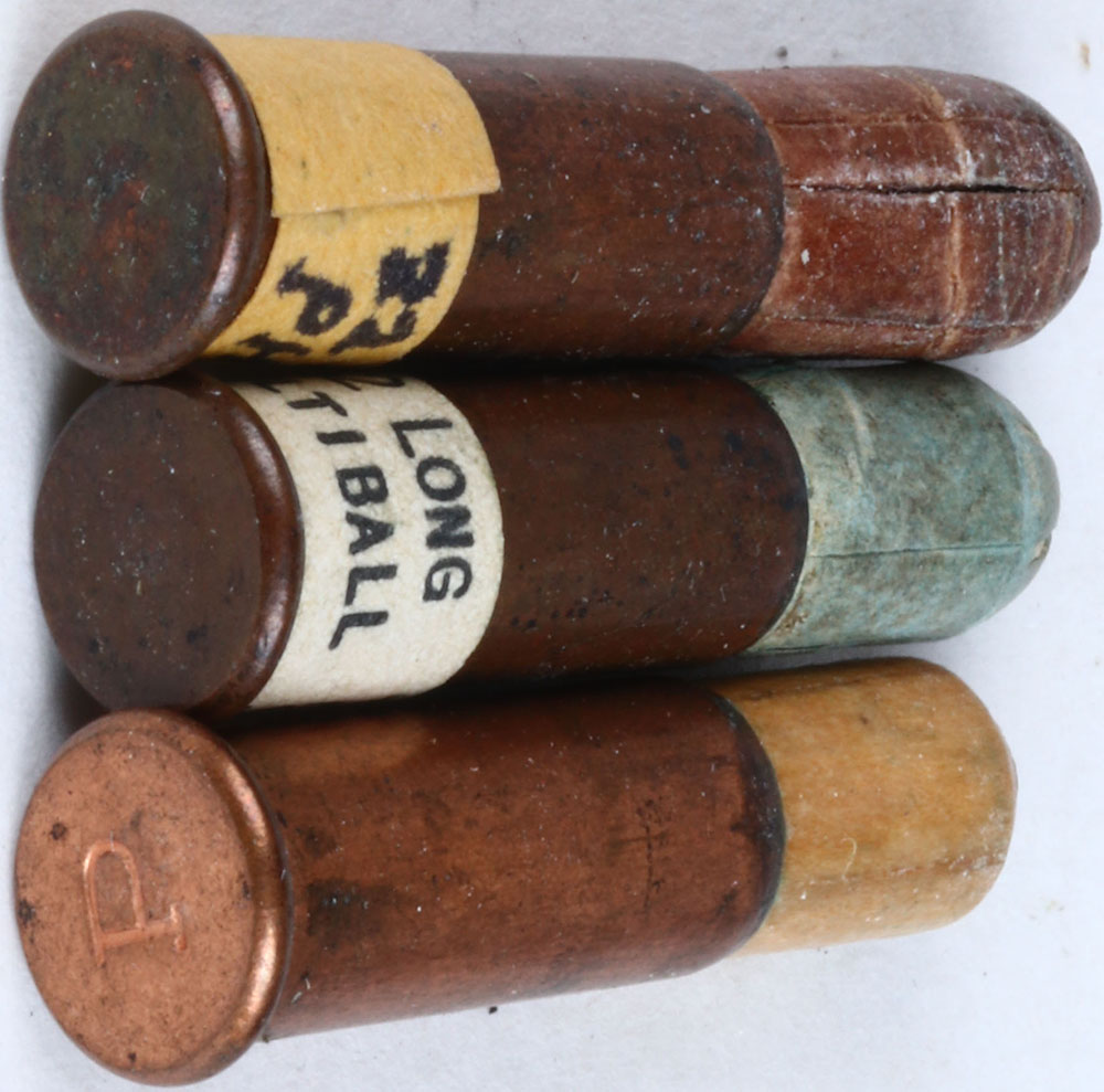 Lot of 3 R/F (1) N/H 32 long Phoenix Multiball COP. CS. Tan paper sabot (1) N/H 32 long Phoenix Multiball COP. CS. Faded blue paper sabot (1) H/S= (IMP.) ''P'' 32 long shot load wood sabot. Grade: Very Good ++ - Value: 20 to 50