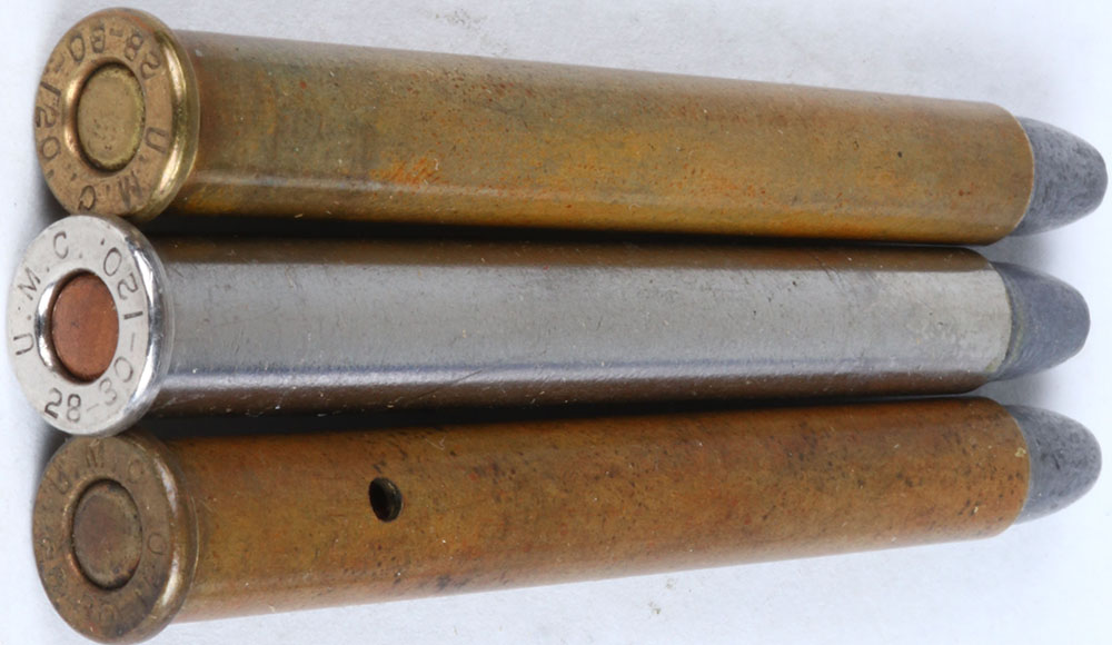 Lot of 3 variations H/S= ''U.M.C. 28-30-120'' Stevens salesman's dummy, 1-CS. Hole internal wood rod, oval BR. PRI., F.N.L. belted H/S= ''U.M.C. 28-30-120'' NIC. Everlasting CS., oval COP. PRI.F N.L. belted H/S= ''U.M.C. 28-30-120'', oval BR. PRI. F.N.L. belted. Grade: Very Good + - Value: 20 to 40