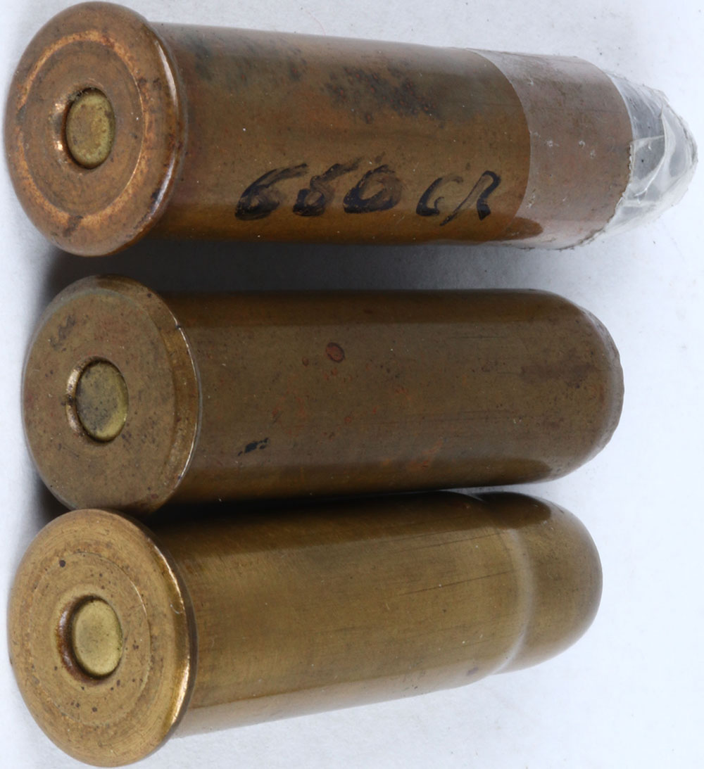 Lot of 3 N/H, 50-70 GOVT. (WIN. MFG.) raised head ring, oval BR. PRI., conical LD. N/H, 50-70 Blank, (WIN. MFG.) HD. Ring, oval BR. PRI. FMD. Mouth, buff wad. N/H, 50-70 blank, (WIN MFG.) FLT. HD. Oval BR. PRI. Grade: Very Good + - Value: 10 to 30