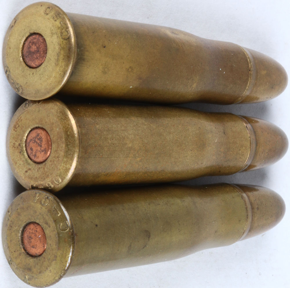 Lot of 3 (2) H/S= (raised) ''G. D C-90'' 10.4 x 47R Italian, bev. Rim large oval copper primer, FP. BR. RN. (1) H/S= ''V. S C-91 (raised) 2-hole board dummy, 10.4 x 47 R Italian oval, copper primer, FP. BR. RN. Grade: Excellent - Value: 10 to 40