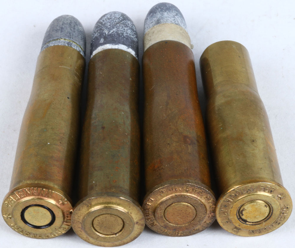 Lot of 4 Variations (2) H/S= (raised) '' H. UTENDOERFFER NURNBERG'' 10.5 x 47 R, large flat brass primer (1) PP. RNL. And (1) with RNL (1) N/H 10.5 x 47 R, large flat brass primer, FNL. 1-GR (1) H/S= (raised) '' H. UTENDOEFFER NURNBERG'' 10.5 x 47 R, large flat brass primer, NPE. Grade: Very Good ++ - Value: 10 to 30