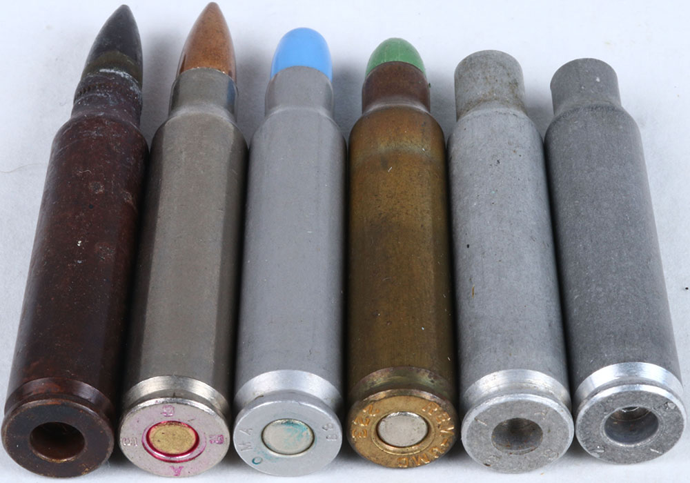 Lot of 6 (1.) H/S= ''REM-UMC 222'', (5.56x45) ''Flachett'' FLT. NIC. PRI. Green poly R.N. (1.) H/S= ''R.A. 65'', 5.56x45'', ''proof'' FLT. BR. PRI., F.P. G.M. PTD. (2.) H/S'S= ''FA 68 & FA 72'', 5.56x45 2 empty aluminum case (1.) H/S= ''OMA 88'', 5.56x45, alu. Case FLT. NIC. PRI., blue poly R.N. (1.) H/S= ''LC 68'' 5.56x45 BLK. CS. Function dummy, blind pocket, F.P. BLK. G.M. PTD. Grade: Excellent + - Value: 20 to 50