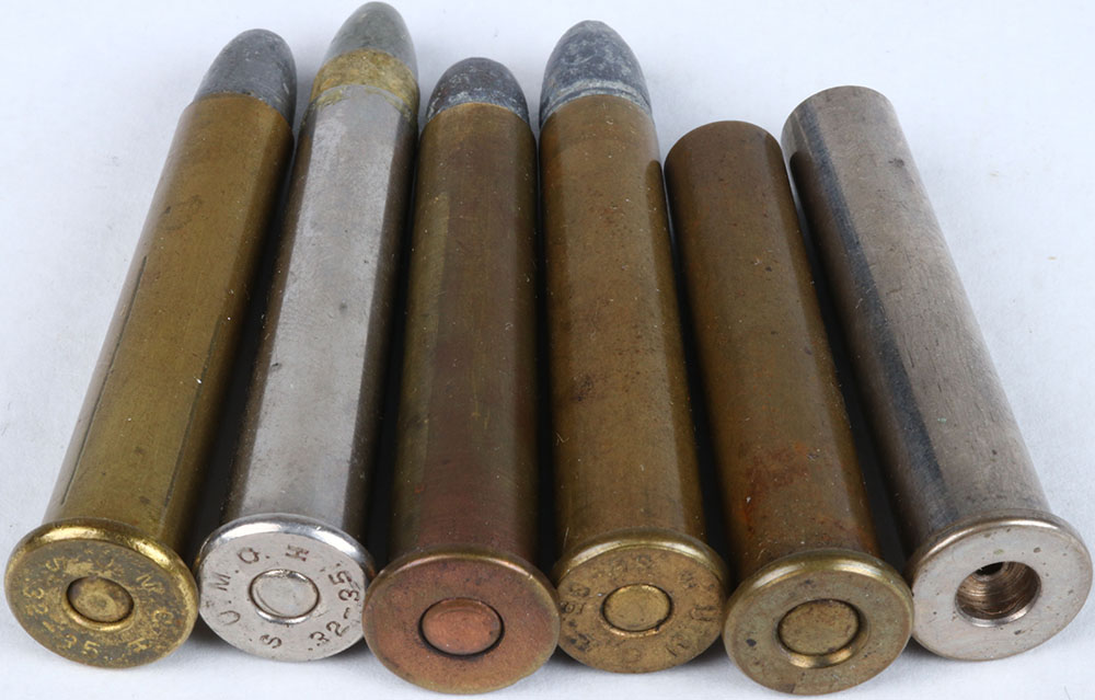 Lot of 6 Stevens (1.) H/S= ''S U.M.C.H 32-35'' NIC ever lasting CS., oval NIC. PRI., P.P. F.N.L. (2.) H/S= ''S U.M.C.H 32-35'', SM. Oval BR. PRI., F.N.L. 1-GR. (1.) N/H, 32-35 Stevens, (early U.M.C.) oval COP. PRI., ''SCARCE'', F.N.L. H.P. B'T. (1.) N/H, 32-35 Stevens everlasting NIC. CS. (not loaded) (1.) N/H, 32-35 Stevens early U.M.C. everlasting BR. CS., oval BR. Berdan PRI., powder charge only. Grade: Very Good ++ - Value: 20 to 50