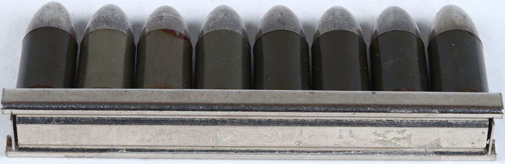 H/S= ''b n x + 751'' 9mm STYR (1912) in full 8 RND. Stripper clip, small flat primer, steel case, FP. TIN. RN. -x Grade: Excellent + - Value: 10 to 30