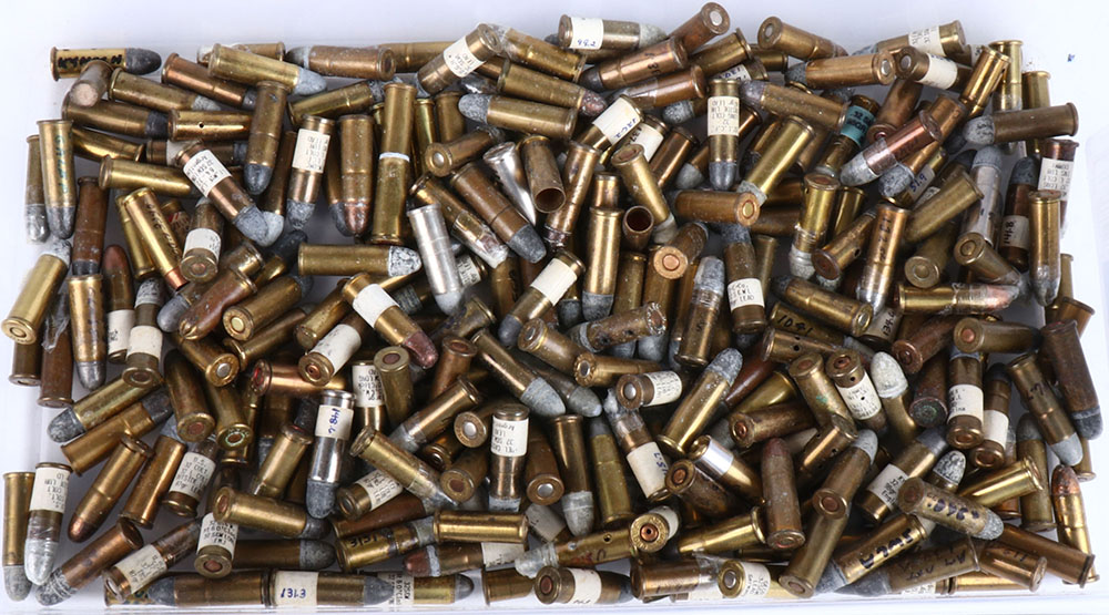Lot of 252= ''32 long colt.'' all different, a mix of both early & later H/S MFG. large variety of PRI. & BL'T'S. with many SPL. Purpose RNDS. B.D.'S function & salesman dummies, short range & gallery loads. Prototypes, TIN CS. Proof loads etc.. Grade: Very Good + - Value: 80 to 140