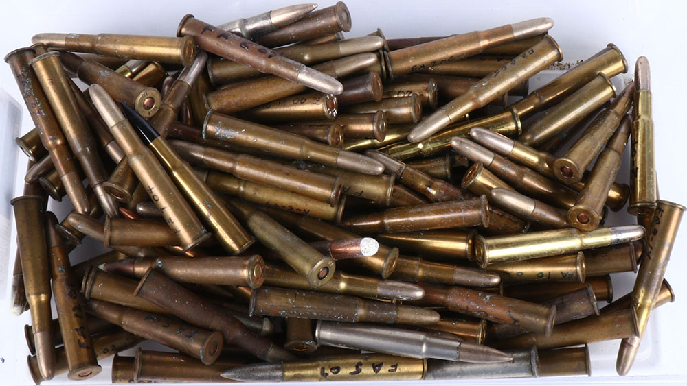 Lot of 125-30-40 krag with a few sporting RNDS, most of this is Frankford arsenal early 1900's dated military all diff., mix of variations. Grade: Very Good + - Value: 60 to 100