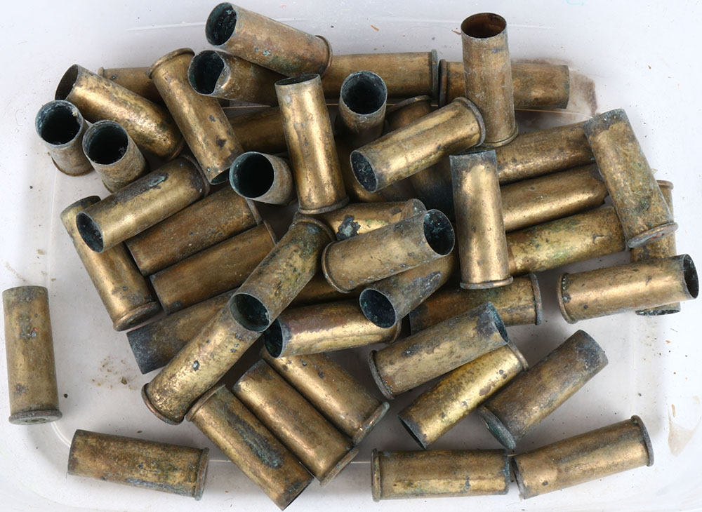 Large lot of 44/40 cases with dented primers, has corrosion on them. Grade: Very Good + - Value: 2 to 100