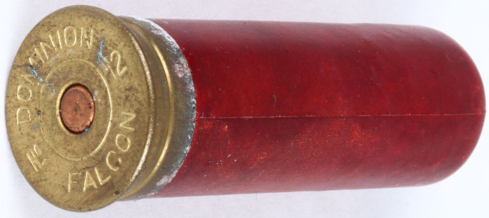 H/S: ''Dominion No 12 Falcon'' 12 ga, loaded shotshell, red paper case, 2 3/8'' OAL, has some age soiling. Grade: Very Good - Value: 6 to 60