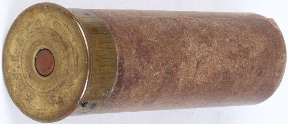 H/S:''W.R.A. Co. No 10 Rival'', 10 ga, loaded shotshell, tan paper case, 2 5/8'' OAL. Grade: Excellent - Value: 6 to 60