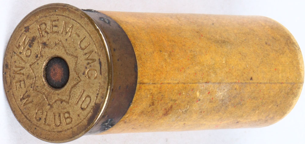 H/S:''Rem-UMC No 10 New Club'', 10 ga, loaded shotshell, yellow paper case, 2 3/8'' OAL, has age soiling. Grade: Excellent - Value: 6 to 60