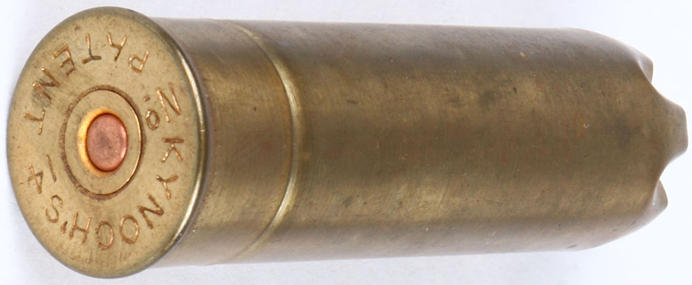 H/S: ''KYNOCH No 14 Patent'' '' 14 ga.! loaded brass shotshell, 2 1/2'' OAL with crimp. Grade: Excellent - Value: 10 to 50