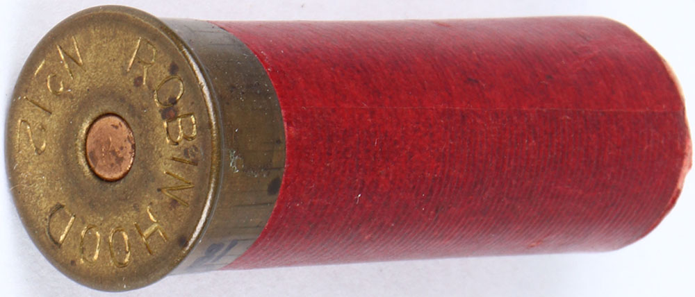 NPE H/S: ''Robin Hood No. 12'' red paper case, 12 Ga., 2 5/8'' OAL. Grade: Very Good ++ - Value: 40 to 200