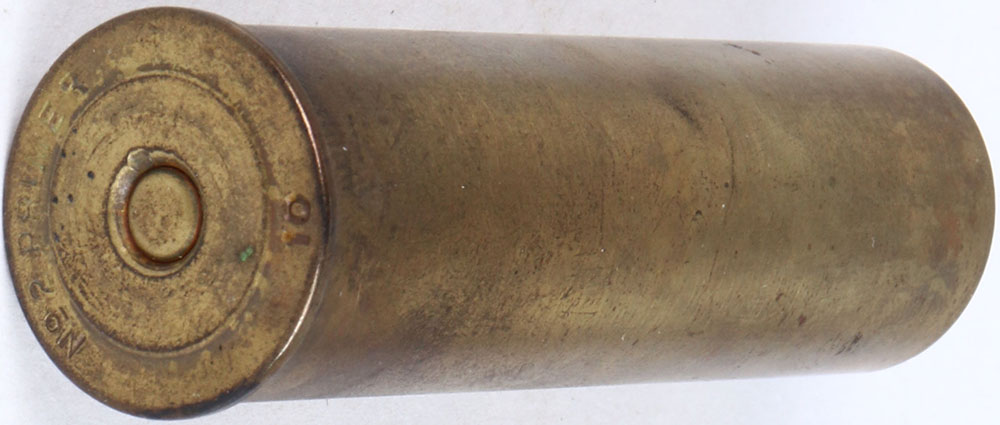 H/S: ''No. 2 Primer 10'' empty brass shotshell, 2 15/16'' OAL, 10 ga.. Grade: Excellent - Value: 4 to 40
