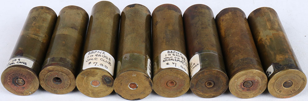 Lot of 10 ga. Brass shotshells, all empty, have age soiling. Grade: Very Good - Value: 30 to 150