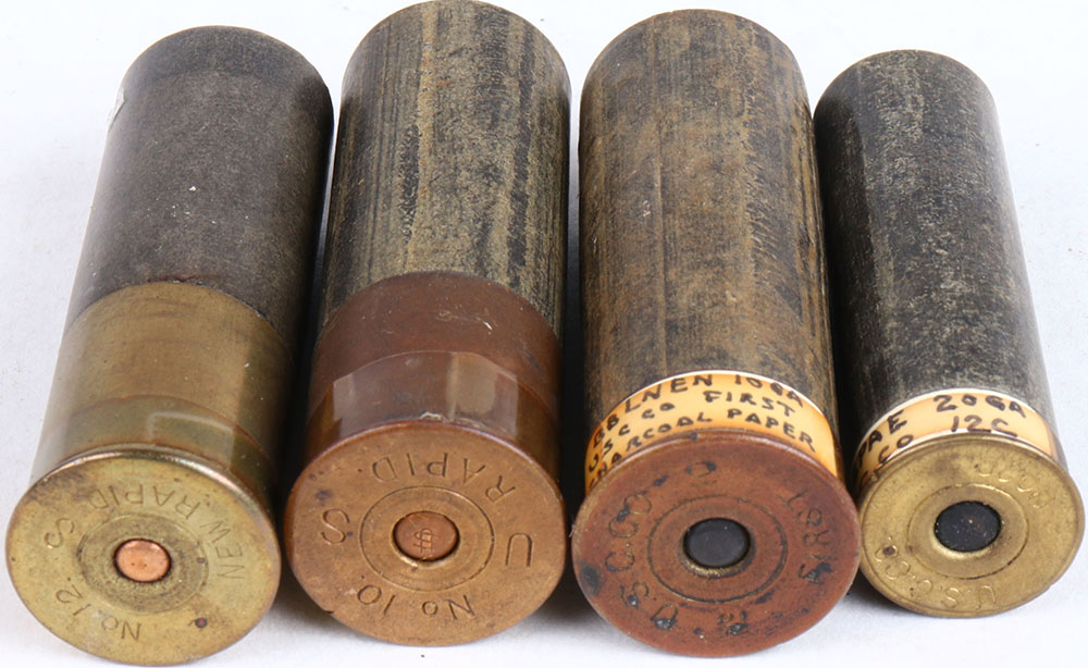 Lot of 4 loaded paper shotshells, all different gauges. Grade: Excellent - Value: 10 to 100