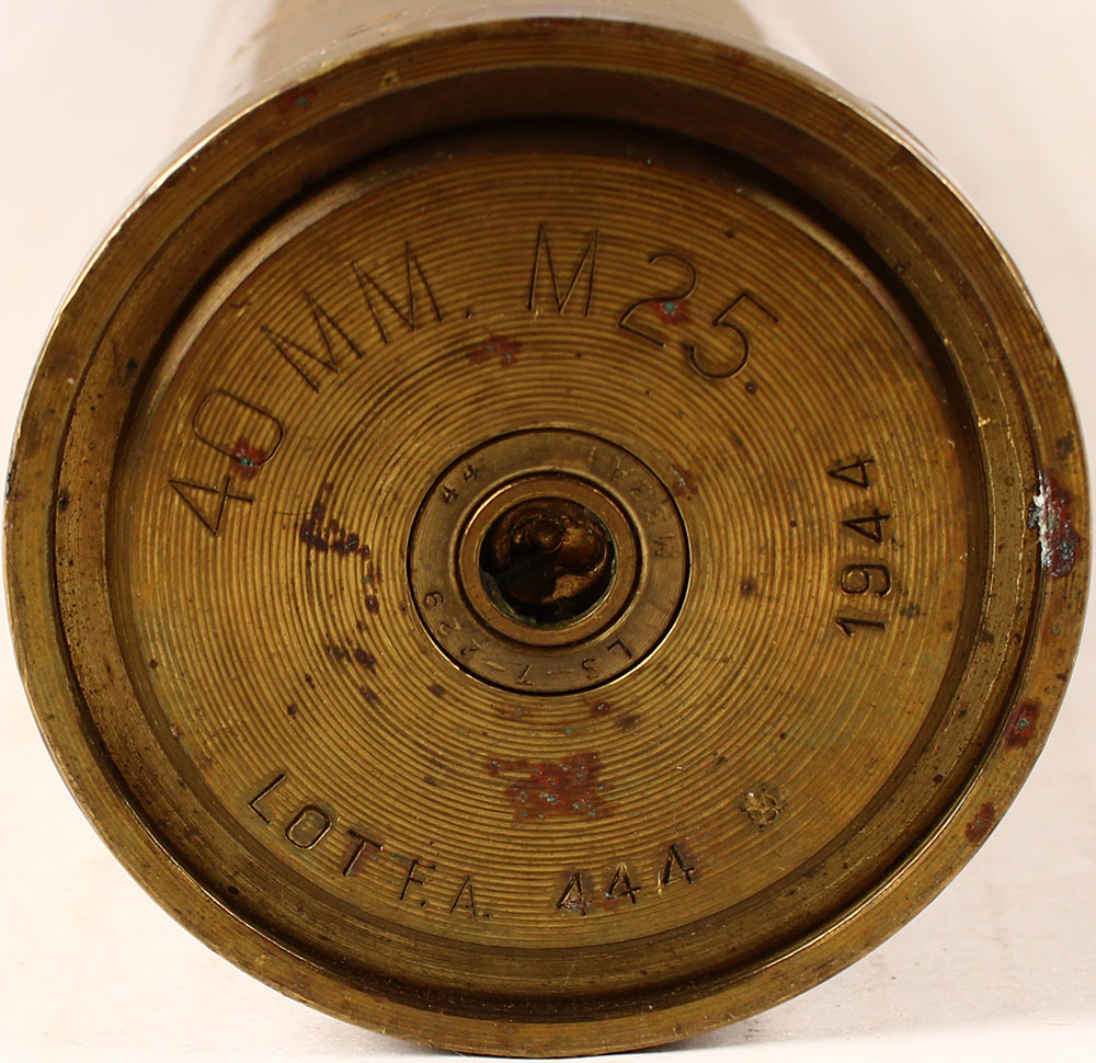 Military brass shell & projectile, 40mm, H/S: ''40MM M25'', ''LOT EA 44A'', ''1944'', primer is marked, ''LS-7-229'', ''M38A1'', ''44'', OAL- 17 1/2''. Grade: very good + - Value: 10 to 100