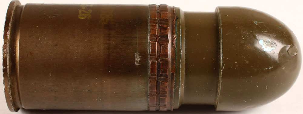 US, 40mm shell & projectile, case is marked, ''CTG., 40MM. PRAC 10385'', ''AMM LOT MA-355-26'', ''CASE CARTRIDGE M169'', ''R?O-3-24-68'', OAL 4 3/8''. Grade: Very Good ++ - Value: 4 to 40