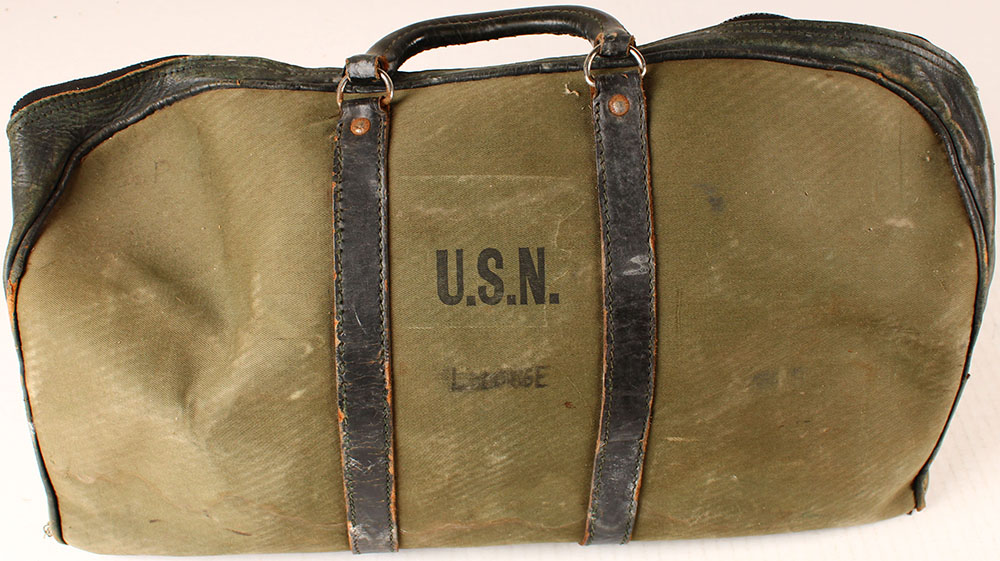 US, WW2 Navy M-432A Pilot Hand Bag, marked, ''U.S.N.'' on outside, ''BAGS:HAND,AVIATORS'', ''SPECIFICATION M-432A'', ''BU AERO - NAVY'', ''ATLANTIC PRODUCTS CORP'', ''CONTRACT NXs-3816'', bag has wear & stains on inside & outside, bag is stiff from age. Grade: Very Good - Value: 30 to 90