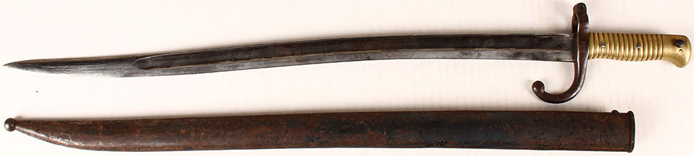 French, Model 1866 Chassepot Bayonet, ''D'' in diamond mark on left side of blade, more markings on left side of blade that are cut off by the guard, left side of guard is marked, ''B'', ''D'' in diamond, ''U'', ''5458'', blade is nice & shows no sign of rust or pitting, comes with sheath. Grade: Excellent - Value: 100 to 200
