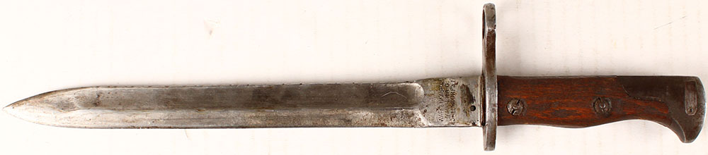 Mauser, Export Bayonet, Left side of blade marked, ''WAFFENFABRIK'', ''MAUSER AG.'', ''OBERNDORFA.N.'', spine of blade has been notched like a sawback bayonet but the notch's are shallow, blade has slight rust speckles & patina. Grade: Very Good ++ - Value: 20 to 60