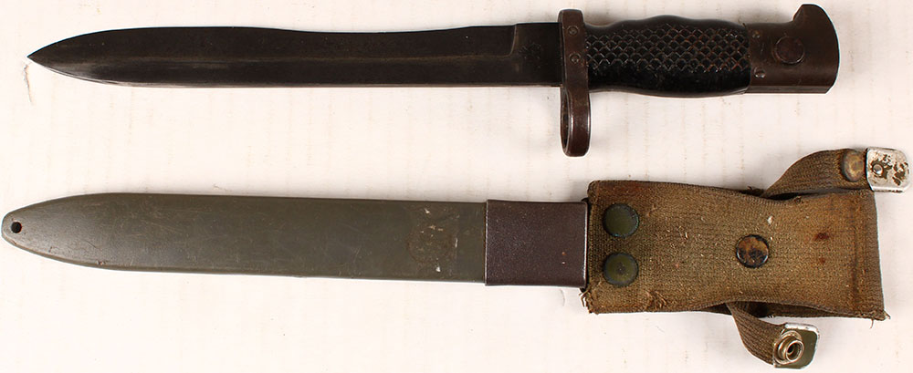 Spanish INI, M1964 CETME Bayonet, left side of blade is marked, ''I.N.I.'', INI logo, ''ET21292C'', right side of blade is marked with the Toledo Coat of Arms, blade has light wear, comes with sheath/frog. Grade: Very Good ++ - Value: 10 to 80