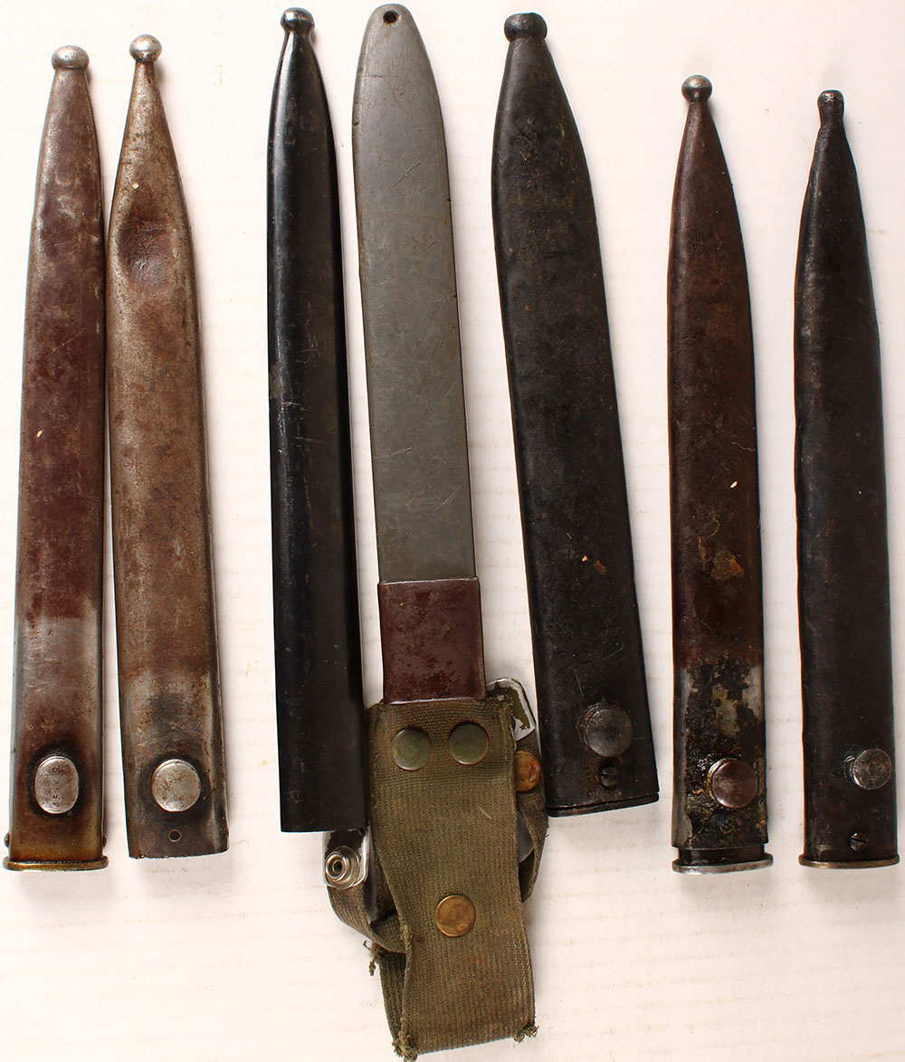 Lot of eight various types of bayonet sheathes. Grade: Very Good + - Value: 10 to 120