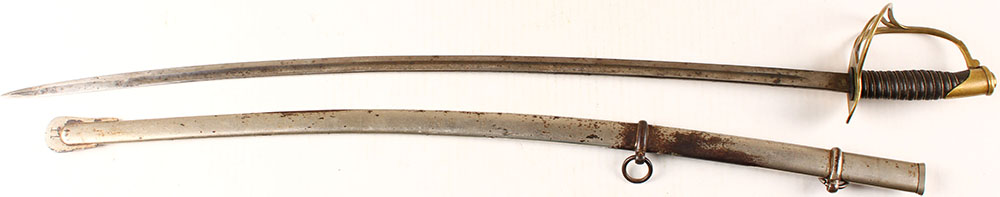 US, M1860 Light Cavalry Saber, Left side of blade marked, ''A'', right side of blade marked, ''U.S.'', blade has spotting of gray patina & light rust starting to from, comes with scabbard. Grade: Very Good ++ - Value: 300 to 600