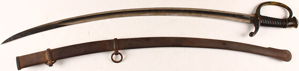 US, M1840 Light Artillery Saber, AMES manufature, 1865 dated, left side of blade is marked, ''by'', ''AMES MFG CO.'', ''CHICOPEE'', ''MASS'', right side of blade marked, ''US'', ''J.F'', ''65'', right side of guard is marked, ''A.D.E.'', blade has chips in edge & small spots of patina, comes with scabbard. Grade: Very Good - Value: 300 to 600
