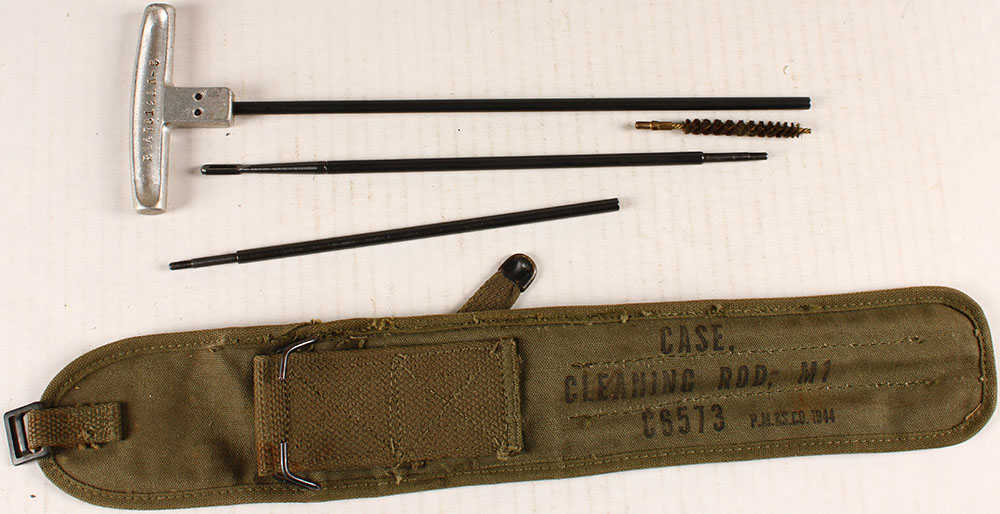 US, M8 Cleaning rod set, cleaning rod handle is marked, ''C.&S. TOOL CO.'', ''B147612A-5'', has pouch, back of pouch is marked, ''CASE.'', ''CLEANING ROD, M1'', ''C6573 P.M.&S.CO. 1944''. Grade: Very Good ++ - Value: 10 to 40
